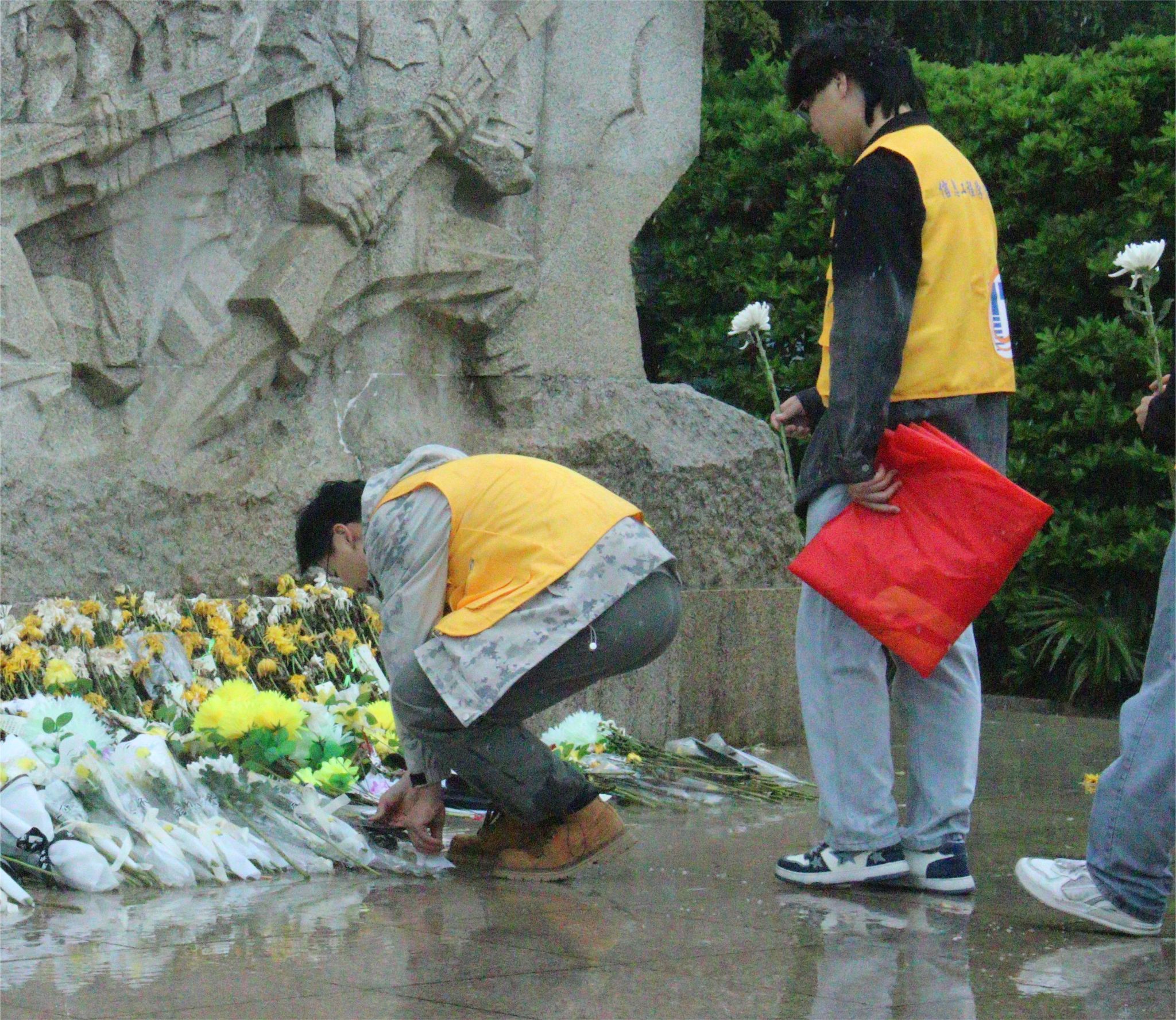 在革命烈士纪念碑前,全体师生肃立默哀,鞠躬行礼,敬献鲜花,祭奠烈士英灵。在中国共产主义青年团团旗前,团员们高举右拳,重温入团誓词,每句誓词铿锵有力,声声高扬,表达出为共产主义奋斗终身的坚定决心。