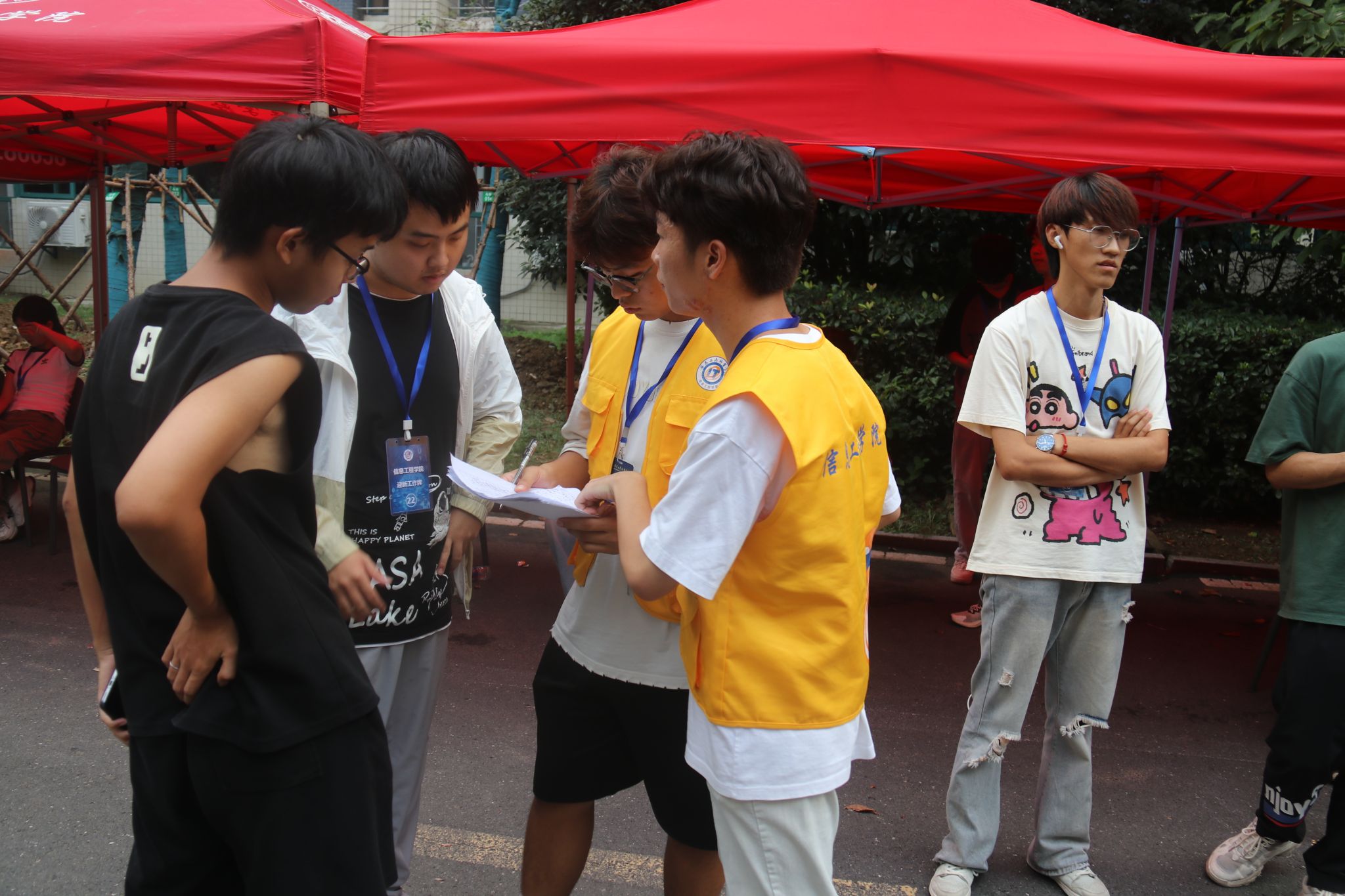 迎新工作如火如荼,到处可见“小黄人”那忙碌的身影。当新生和家长来到接待点时,迎新志愿者们立刻微笑相迎。一条条横幅挂列在空中,24级新生们踏着红毯,穿过迎新拱门立牌走进信息工程学院。学院设立了行李存放、迎新系统录入、人脸采集、钥匙一卡通发放、礼品领取等环节,最后志愿者会引导新生到达所在寝室。