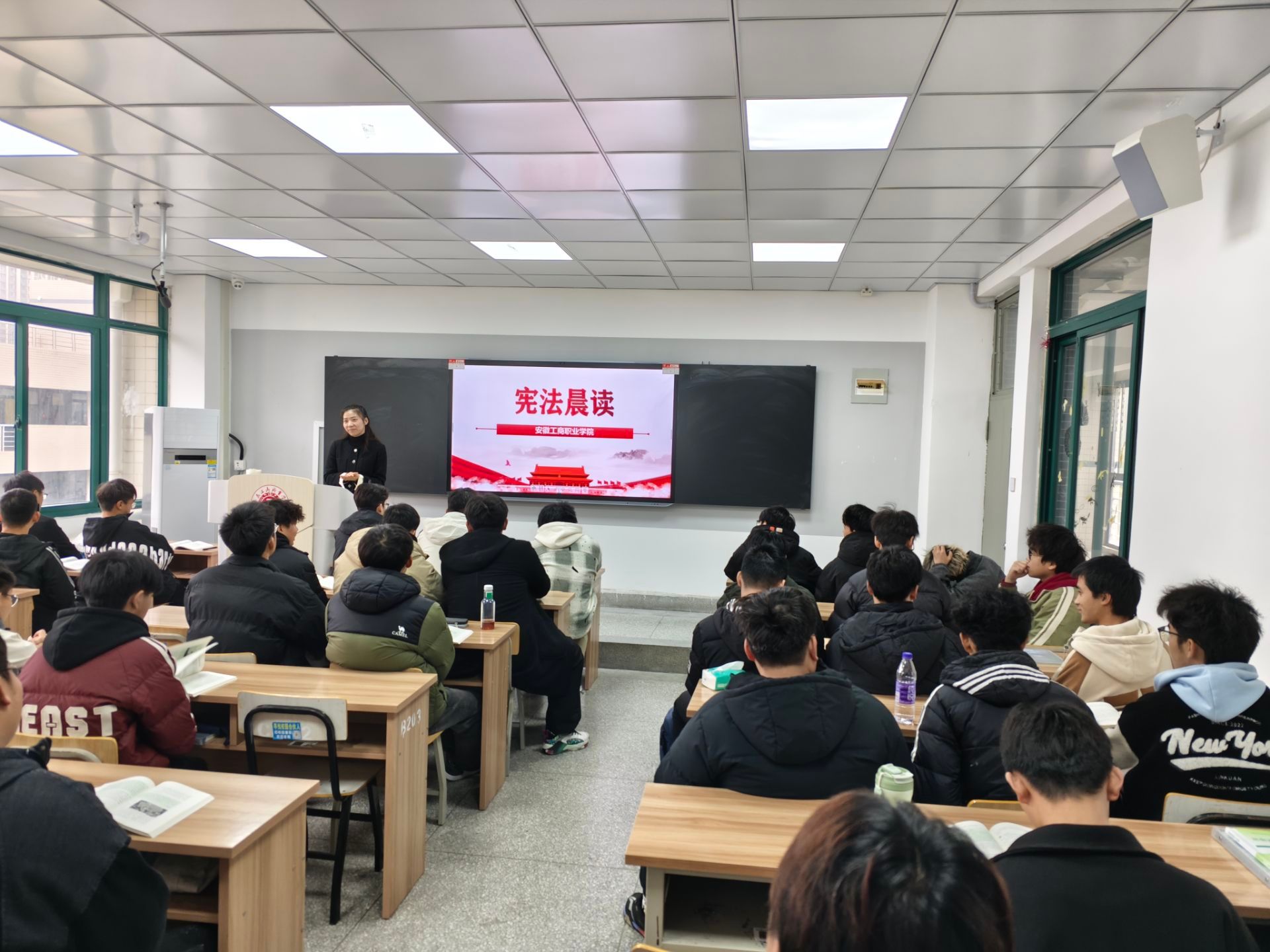 12月4日,信息工程学院组织新生班级开展宪法晨读活动。各班在辅导员的带领下,齐声诵读《中华人民共和国宪法》部分条款。他们用洪亮坚定、铿锵有力的朗读,感悟宪法的权威与力量,对宪法至高无上的尊崇,对法治中国建设的责任担当。