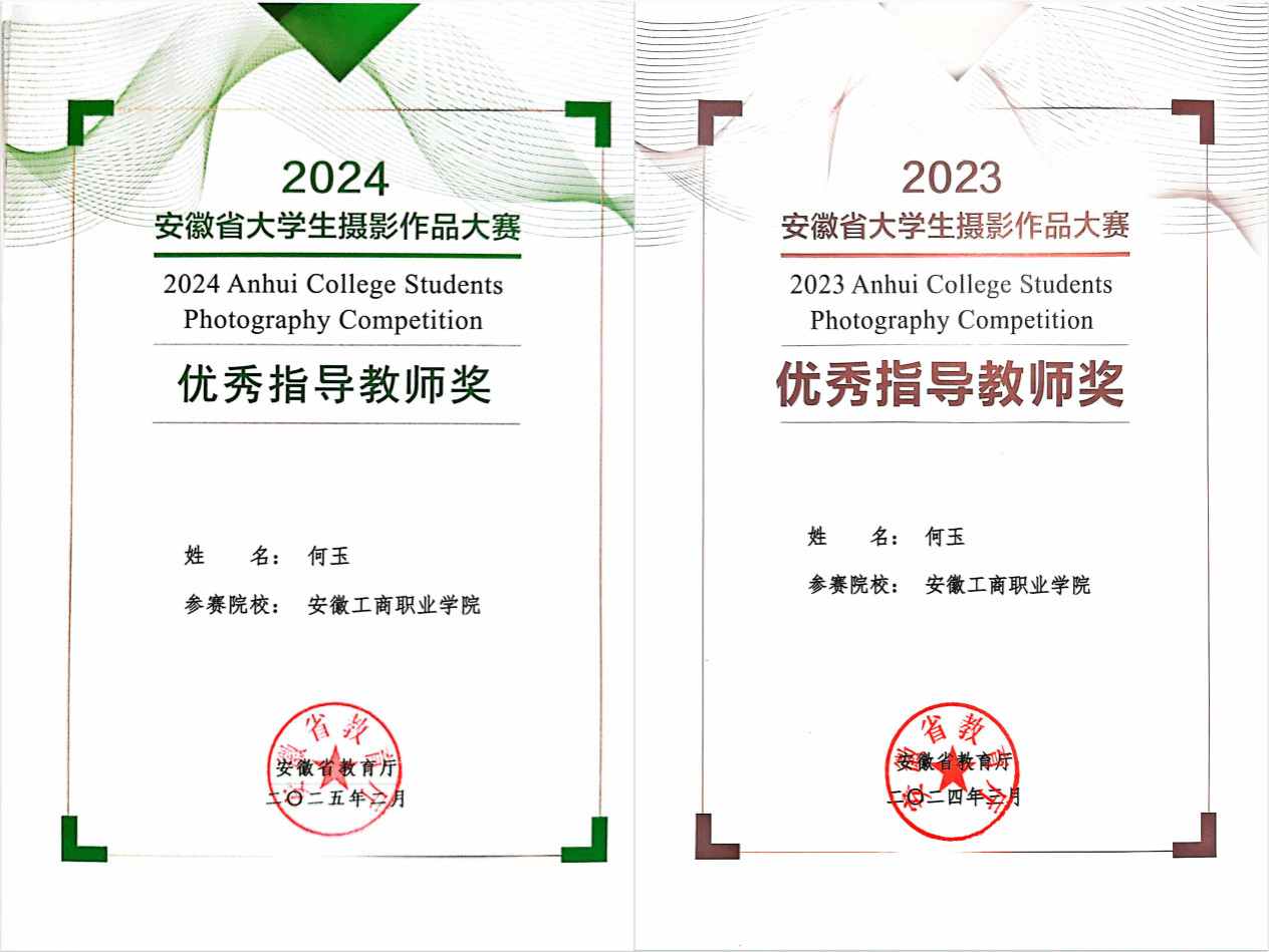 在教学工作中,何玉老师始终坚持"以赛促教、以赛促学"的教学理念,指导学生屡创佳绩:指导学生参加安徽省大学生摄影作品大赛获得一等奖十余项;指导学生参加安徽省大学生挑战杯创业计划竞赛,斩获银奖1项、铜奖3项;指导学生参加全国大学生广告艺术大赛,获得安徽赛区动画类二等奖、视频类微电影广告三等奖。何玉老师本人连续两年荣获安徽省大学生摄影作品大赛“优秀指导教师”称号,荣获2024年安徽省高等职业院校教学能力大赛二等奖,荣获第七届全国数字创意教学技能大赛国赛一等奖,充分展现了扎实的教学功底和专业技能。