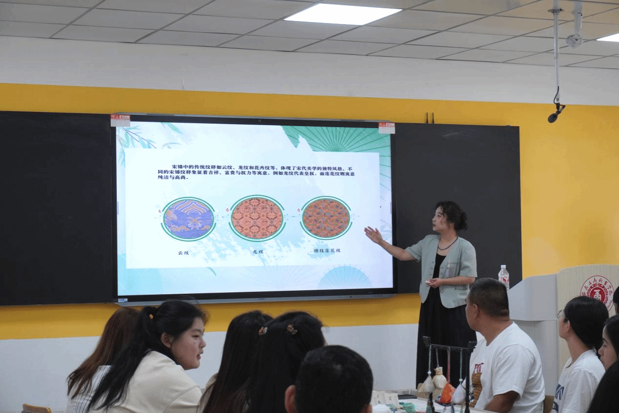 活动伊始,杭梅老师向泰国师生们详细介绍了宋锦文化。宋锦,作为中国传统的丝制工艺品,有着悠久的历史和深厚的文化底蕴,与南京云锦、四川蜀锦并称中国三大名锦。它起源于宋代,因其独特的技艺和精美的图案,在明清时期更是成为宫廷专用之物,象征着尊贵与典雅。老师们通过精美的图片和生动的讲解,让泰国师生们仿佛穿越时空,领略到宋锦在历史长河中的独特魅力。