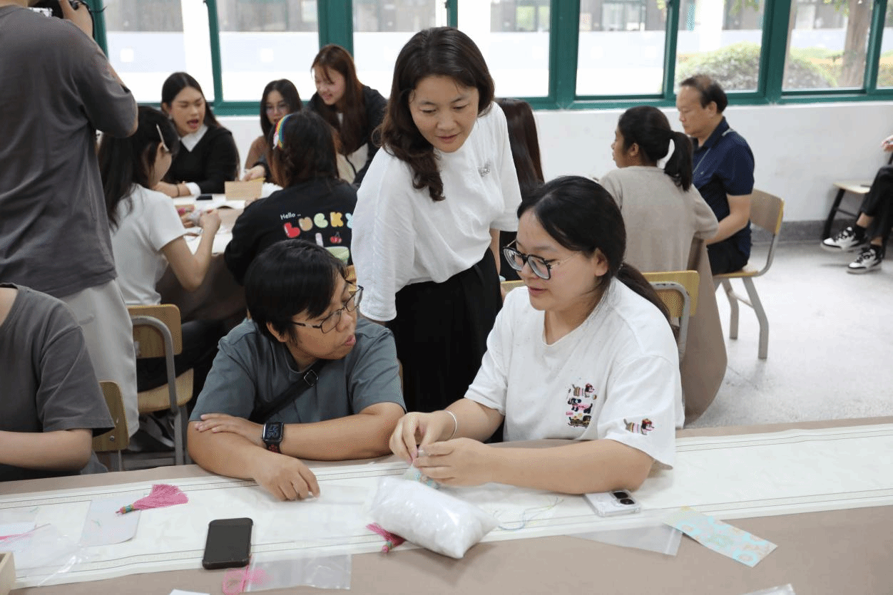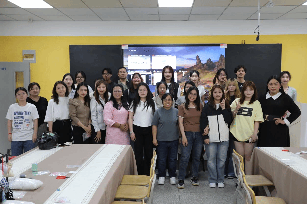 5月22日,动漫制作技术教研室党支部的杭梅、杨静两位老师热情接待了来自泰国皇家理工大学的师生代表团一行 19人,精心呈现了一场“非遗织造—宋锦手作体验”。此次活动不仅是一次文化交流的盛宴,更是对中华优秀传统文化的生动传播。