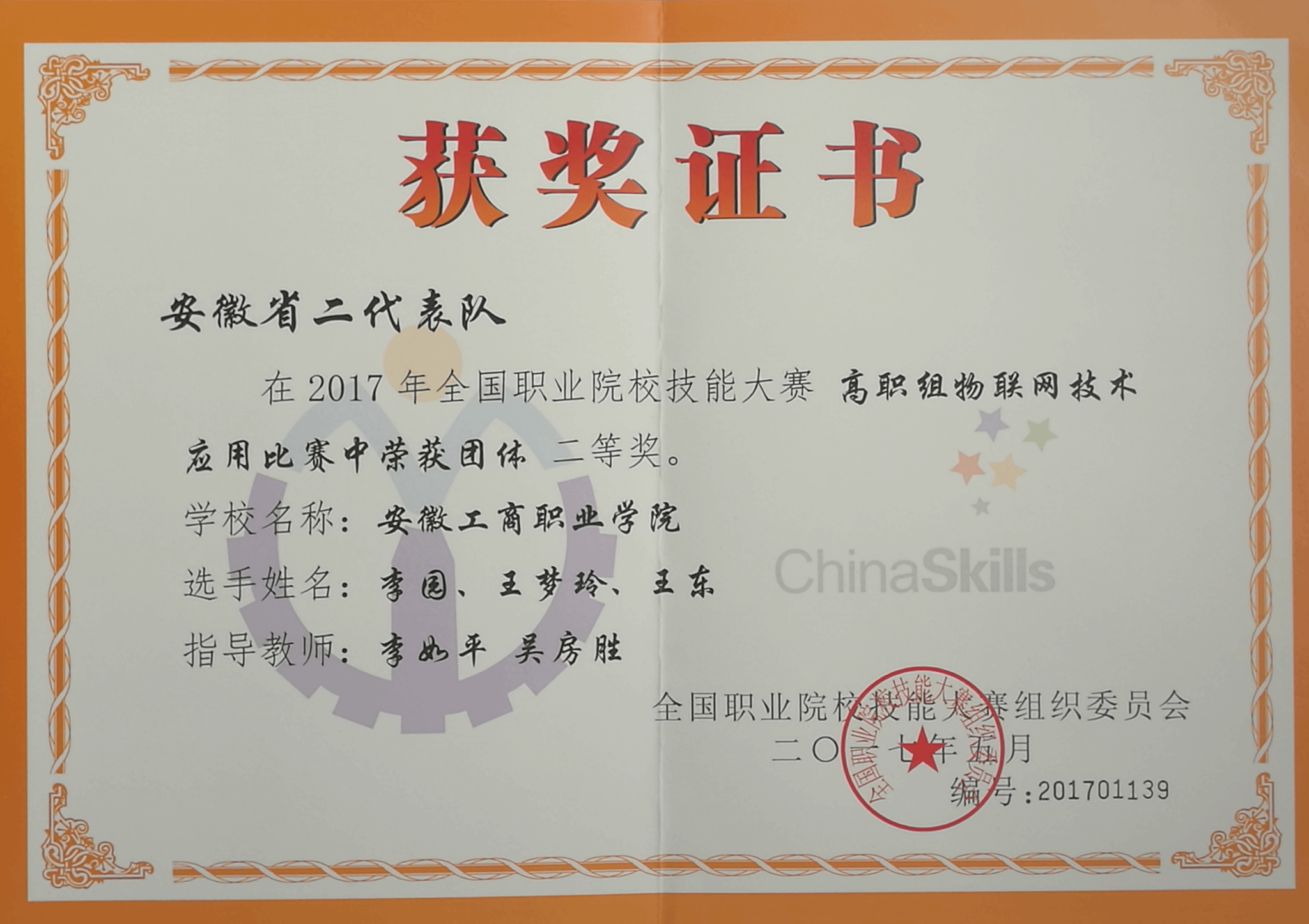 2017年安徽省职业院校技能大赛- “物联网技术应用”赛项二等奖;
