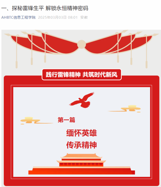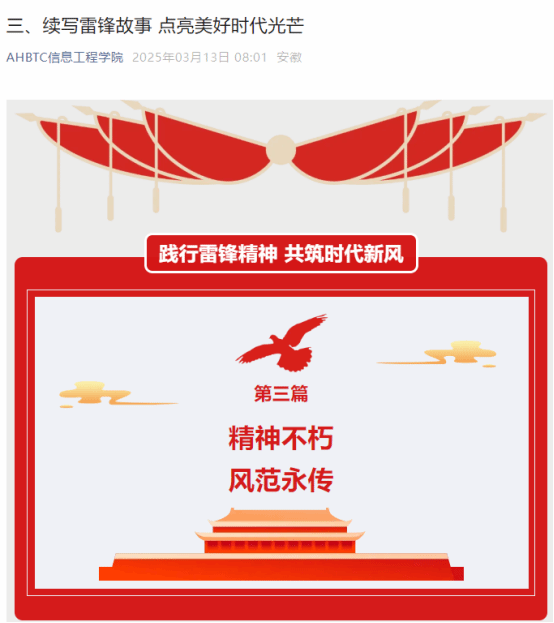 学院在微信公众号平台同步推出“雷锋精神数字传播”专栏,通过图文结合与短视频展播的形式,系统梳理雷锋生平事迹,深入解读雷锋精神的时代价值,并联动展示征集活动中的优秀作品,构建线上线下融合的宣传矩阵。