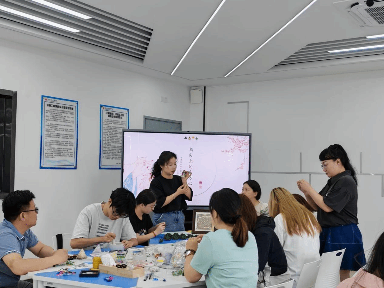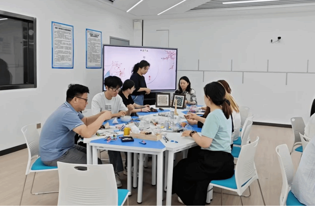 在制作过程中,党员们充分发挥先锋模范作用,耐心指导学生。同学们积极参与,有的精心进行掐丝珐琅的点蓝工序,有的则在宋锦挂件的装饰上细细思量。遇到问题时,大家相互交流、探讨,现场气氛热烈而融洽。
