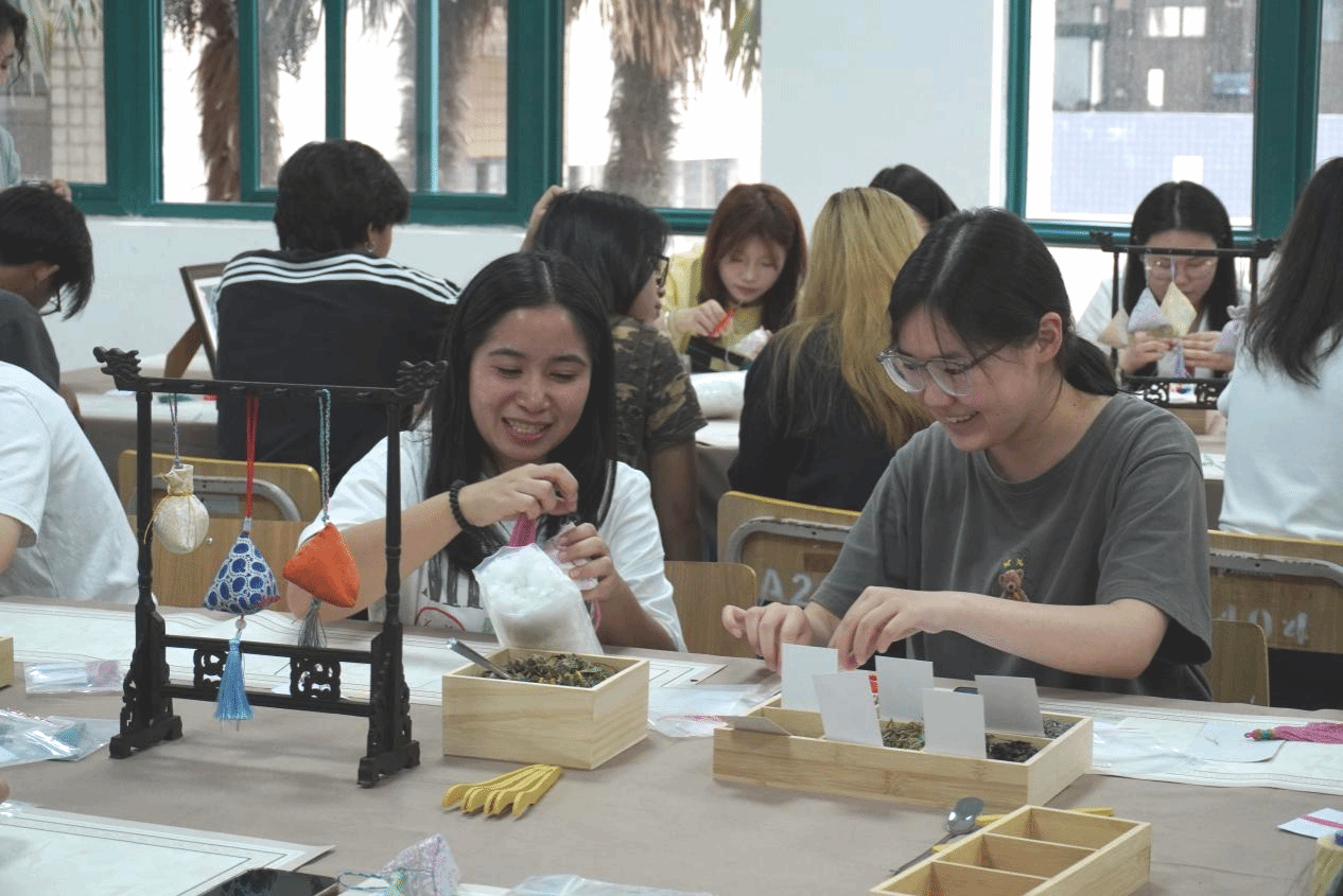 恰逢端午节即将来临,活动还特别安排了粽子形宋锦香包的制作体验环节。香包,在中国传统文化中有着驱虫辟邪、祈福纳祥的美好寓意。杭梅、杨静两位老师在国际交流与继续教育学院的支持下,精心布置活动环境,准备制作材料。活动现场,从色彩斑斓的宋锦面料,到散发着淡淡药香的香料,每一样物品都承载着传统文化的韵味。在杨静老师的帮助下,一位泰国教师率先完成了粽子形宋锦香包的制作。第一个作品的诞生,如同一颗投入湖面的石子,激起层层涟漪,为整个体验环节带来高潮。看到精美的香包在手中呈现,现场气氛热烈起来,其他师生也备受鼓舞,更加干劲十足地投入到制作中。