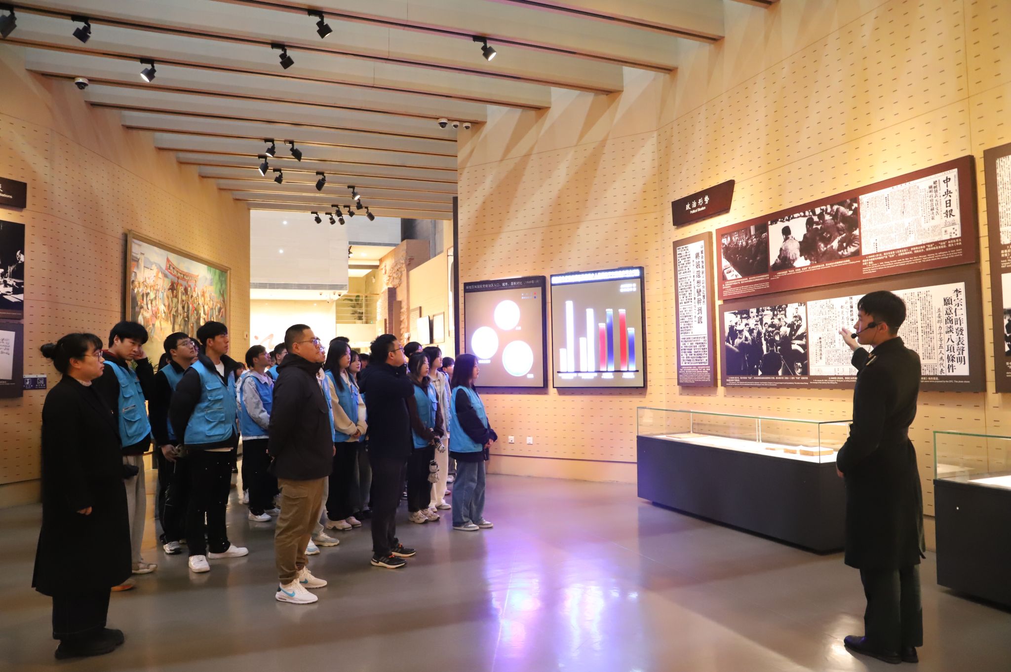 纪念馆内,学院团总支书记杨东带领师生党员,面向鲜红的党旗,高举右拳,重温入党誓词。随后,在讲解员的带领下,全体成员依序参观了战前形势、战役准备、突破江防、战役胜利、人民支前、英烈业绩等展厅,深刻了解渡江战役,真切感受到革命时期总前委的运筹帷幄、人民解放军的足智多谋与一往无前、军民团结的鱼水深情,广大解放军指战员和人民群众共同创造了可歌可泣的光辉业绩。此外,全体同学还前往安徽名人馆继续参观学习。同学们感受到了安徽几千年来的历史文明变迁,也感受到了中华文明深厚的文化底蕴。