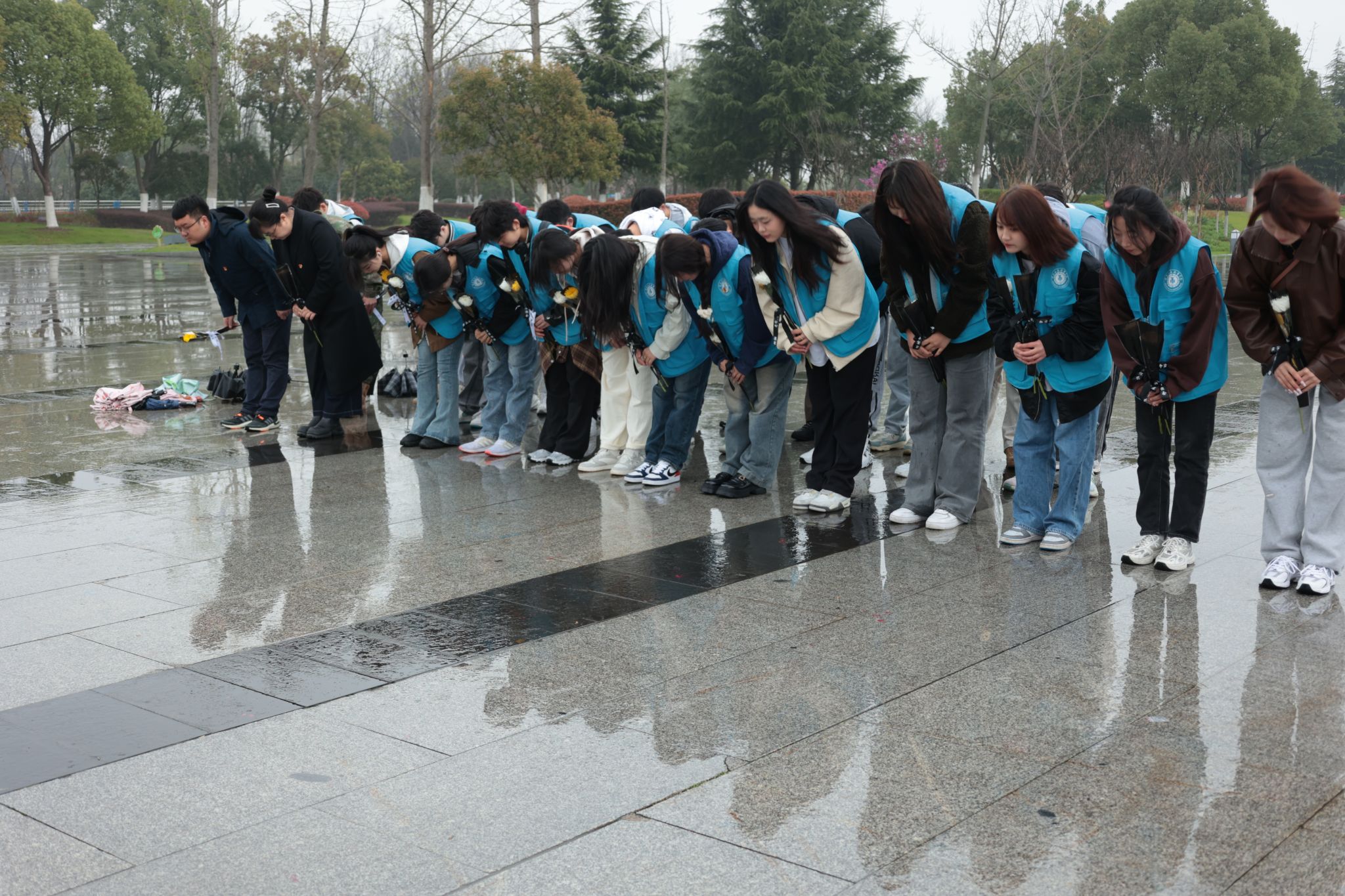 渡江战役纪念馆坐落在安徽合肥美丽的八百里巢湖之畔。上午9点,怀着对烈士们的无限崇敬,学院师生冒着蒙蒙细雨来到了广场雕像前,瞻仰了邓小平、刘伯承、陈毅、粟裕、谭震林五位总前委成员的巨型塑像。高大的群雕生动形象地展现了五位总前委运筹帷幄、决胜千里,指挥百万雄师横渡长江天堑的雄才大略与宏伟气度。随后学院师生面向烈士纪念碑,敬献鲜花,以示哀思和悼念,团员青年重温入团誓词,深刻缅怀革命先烈的丰功伟绩。