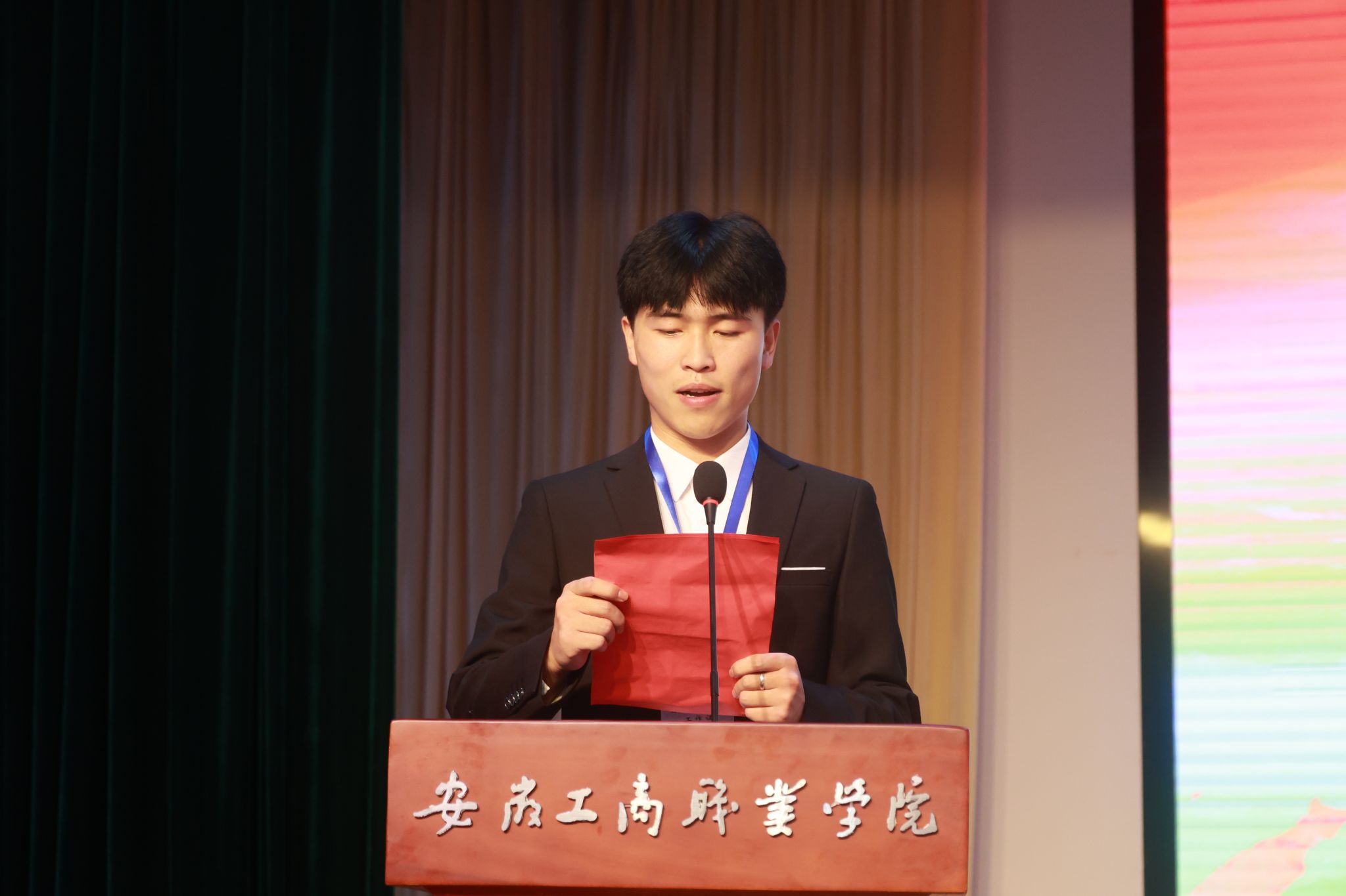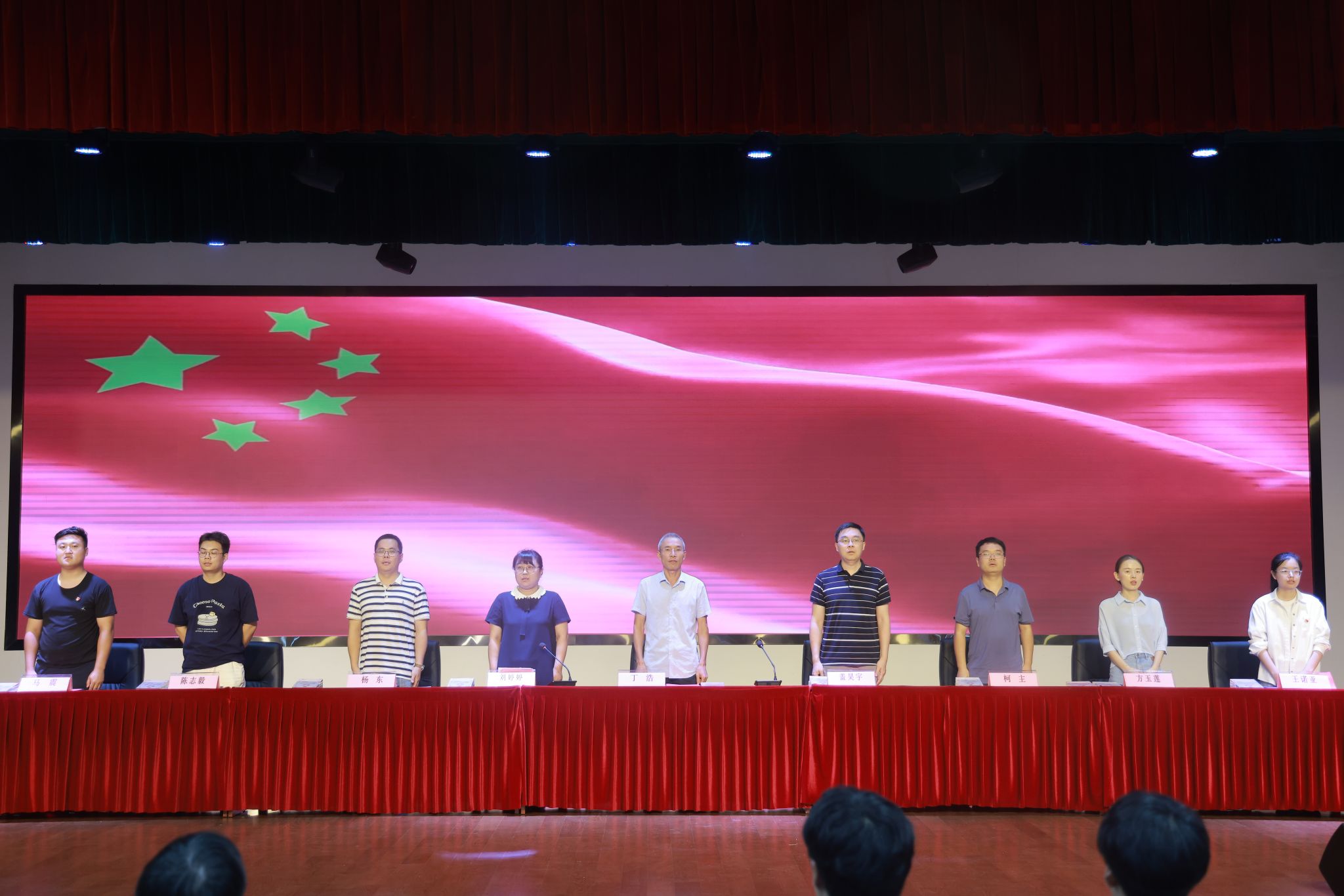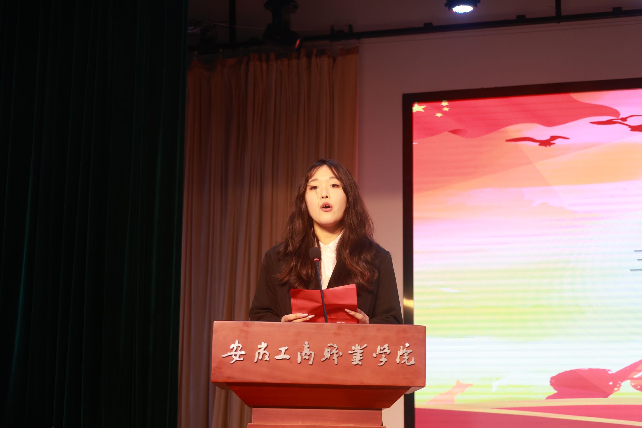 学院团总支负责人宣读了学院新一届学生会班子成员名单。随着交接仪式的音乐缓缓响起,第七届学生会代表和新一届学生会成员完成了授牌和旗帜交接。在学生会办公室主任方怡同学的带领下,新就职学生会同学进行了集体就职宣誓。学生会主席唐博涵在表态发言中郑重承诺,将坚守学院学生会精神,带领新一届学生会成员积极进取、开拓创新,争取更加辉煌的成绩。