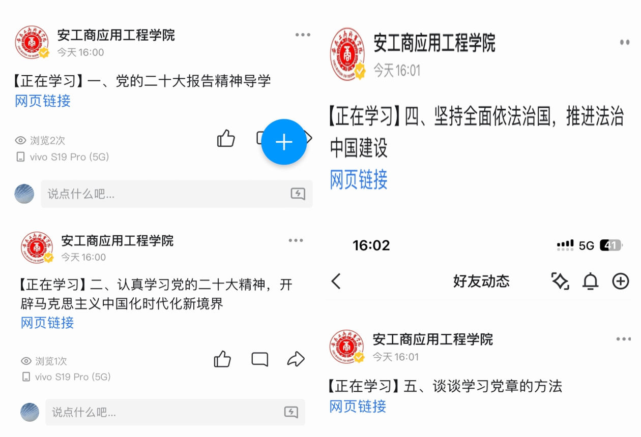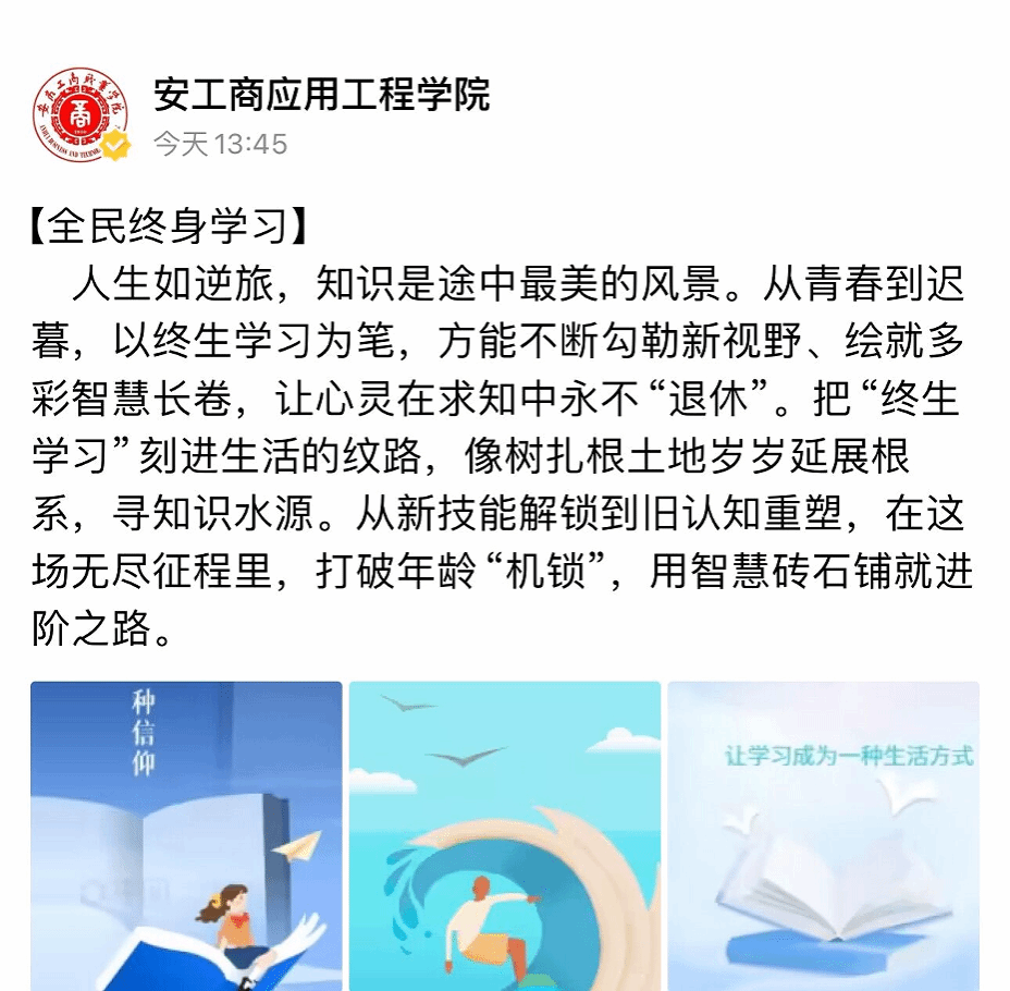此外,学院融媒体中心于线上开辟学习专栏“正在学习”,推送、转载各类网络学习资源数十篇,不断探索创新深化全民终身学习活动有效路径。后期学院融媒体中心将充分利用QQ、微信公众号等宣传阵地,及时总结凝练典型经验、深挖感人故事,加大宣传推广力度,多层次、多角度、全方位开展全民终身学习活动情况、有效做法、典型人物故事宣传,大力营造全民终身学习的良好校园环境和浓厚氛围。
