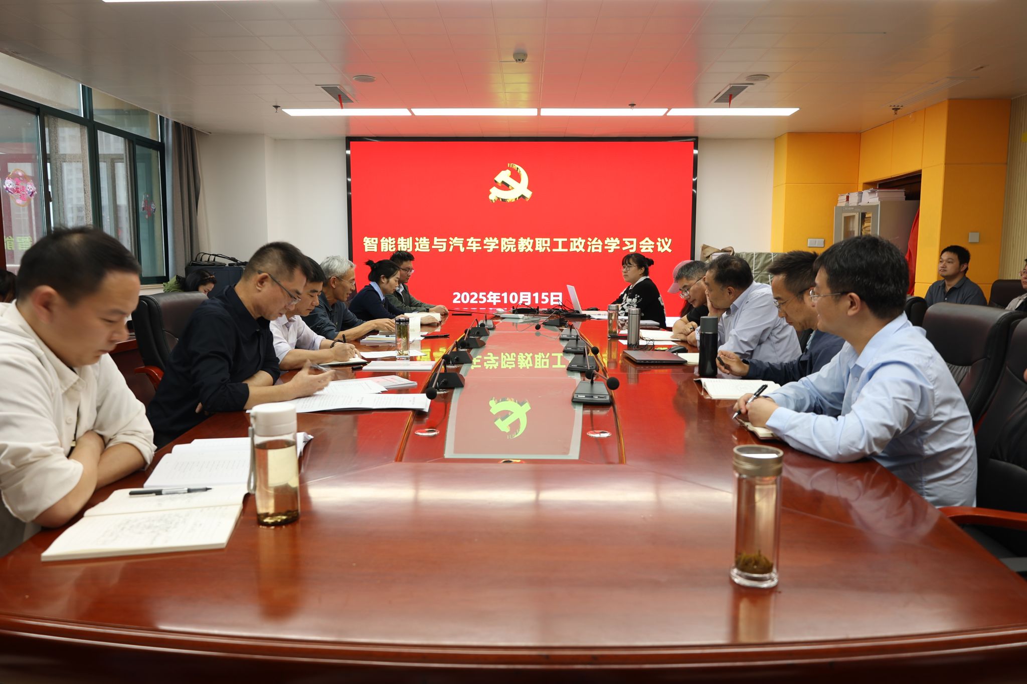 10月15日,智能制造与汽车学院党总支在第六会议室召开教职工政治学习,会议由党总支书记丁浩主持,全体教职工参加会议。