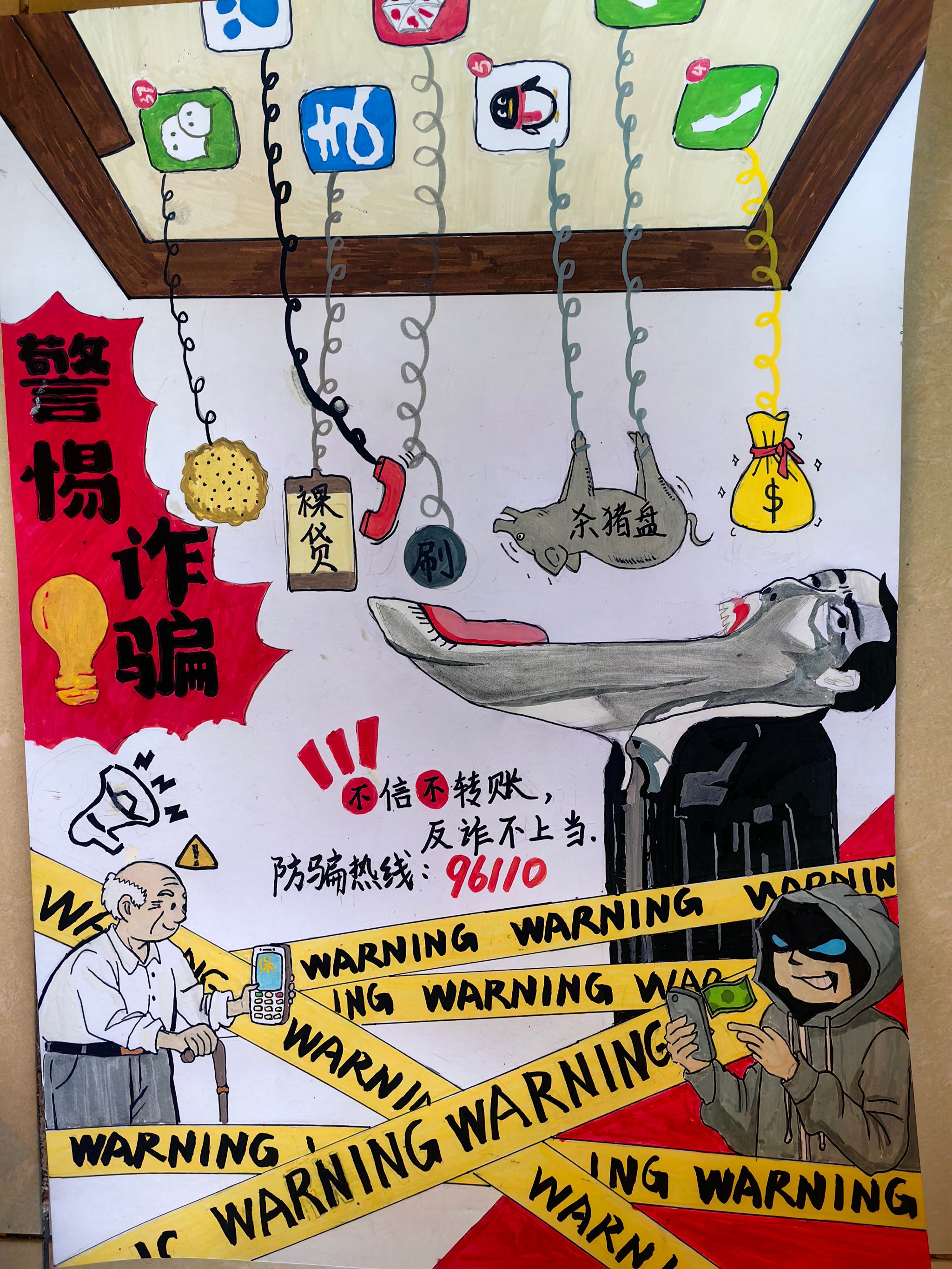 大赛自启动以来,得到了全院学生的热烈响应和积极参与。同学们围绕校园高发的“冒充客服退款”“校园贷陷阱”“虚假兼职刷单” 等诈骗类型,结合生活中听闻的反诈案例与对《中华人民共和国反电信网络诈骗法》的理解,充分发挥想象力与创造力。创作过程中,有的同学以鲜明色彩对比揭露诈骗套路,用夸张漫画形式还原骗子行骗场景;有的同学通过图文结合的方式,清晰标注反诈要点与求助途径;还有的同学融入校园生活元素,让海报既有警示意义又充满青春气息,实现了反诈知识与艺术创意的巧妙融合。活动累计收到参赛作品几十幅,每一幅作品都凝聚着学子们对反诈工作的思考与担当。