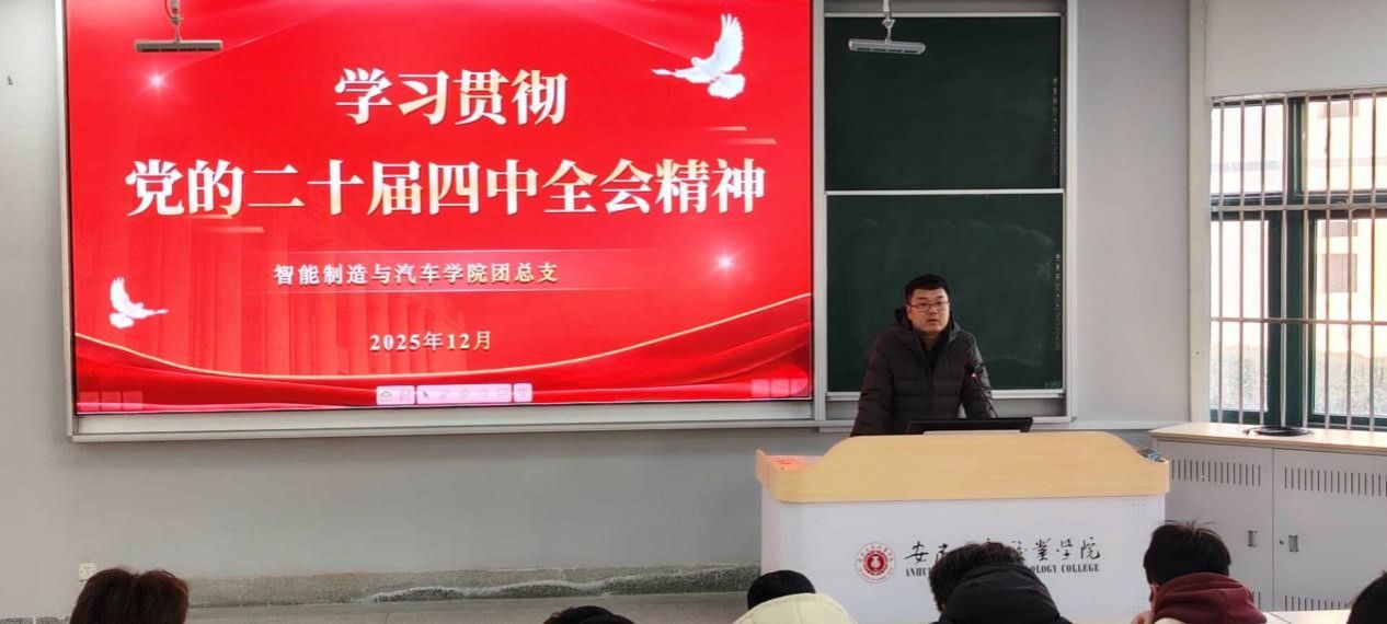 为深入学习贯彻党的二十届四中全会精神,引导青年学生坚定理想信念、勇担时代使命,12月26日,智能制造汽车与汽车学院团总支书记柯主以专题团课形式,为学院团总支、学生会骨干及青年学生代表带来了一场思想深刻、内容丰富的学习盛宴。