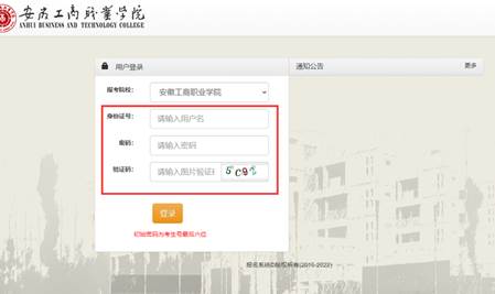 访问安徽工商职业学院网上报名系统,凭身份证号、密码(初始密码为考生号最后六位)和验证码登录报名系统。