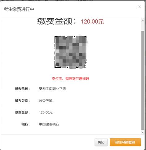 点击确定按钮,跳转至二维码缴费页面(具备支付宝和微信支付条件考生可以扫描二维码支付),也可点击前往网银缴费。