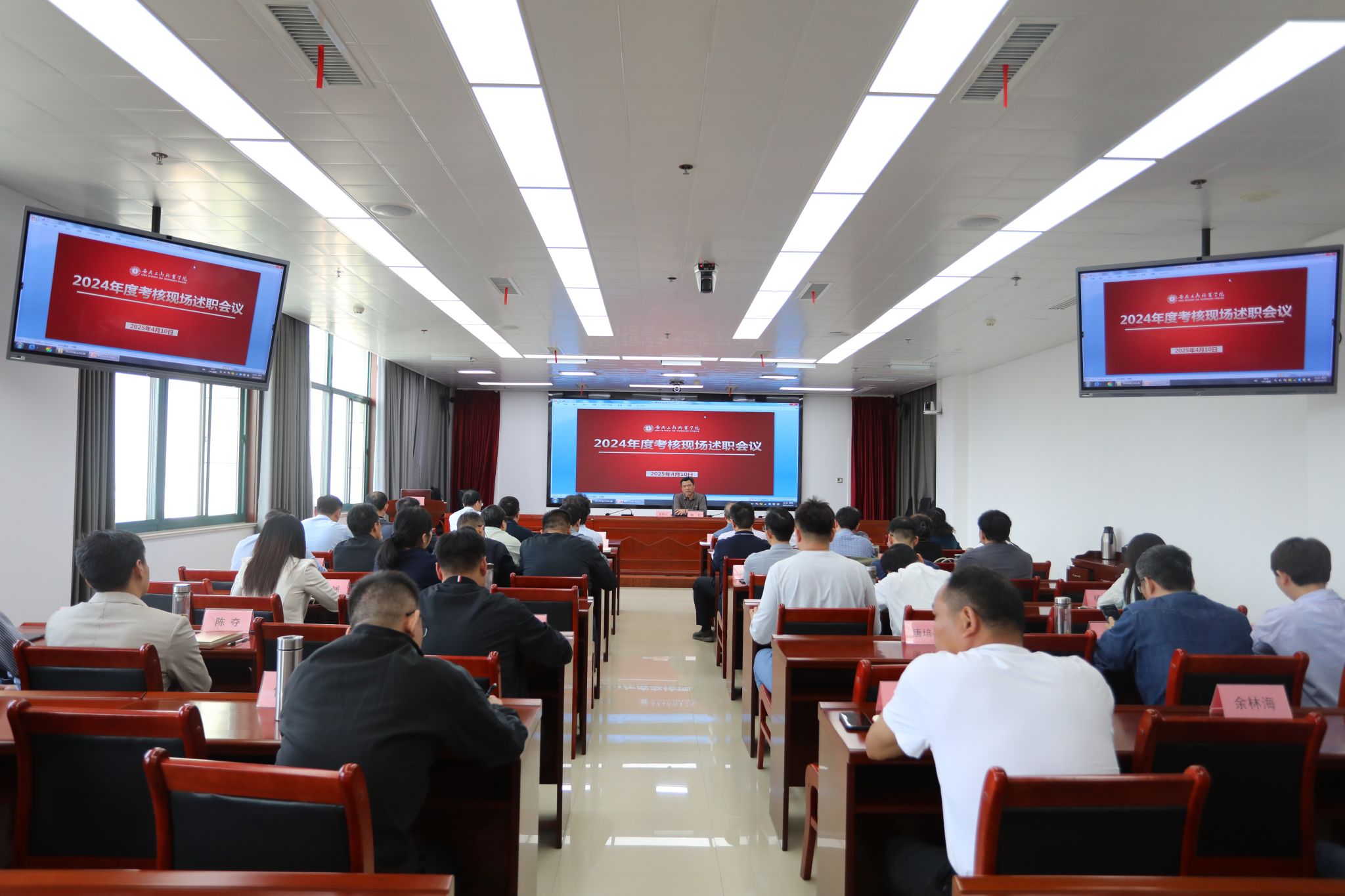 4月10日下午,学校召开2024年度考核现场述职会,校党委书记齐建平、党委副书记陈行、副院长胡捍东、副院长陈章奇出席会议,全体中层干部参加会议。会议由陈行主持。