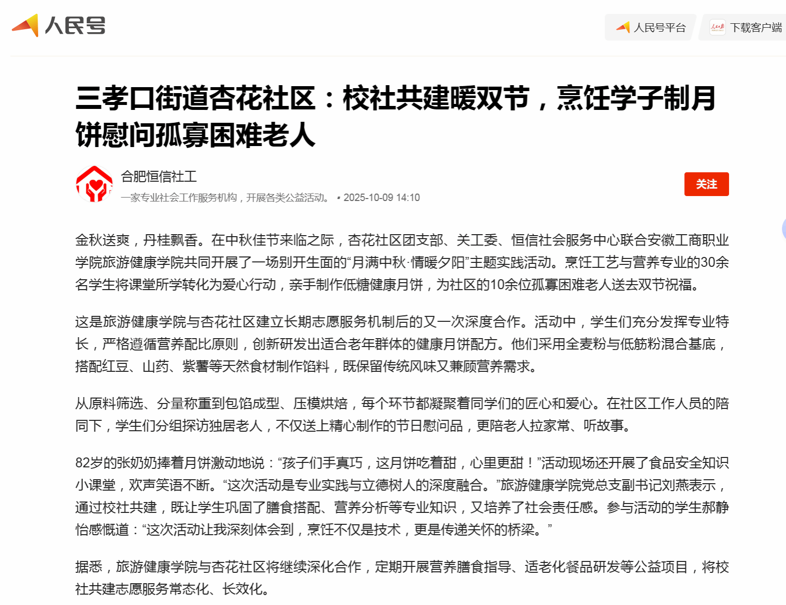 【人民号】报道:三孝口街道杏花社区:校社共建暖双节,烹饪学子制月饼慰问孤寡困...