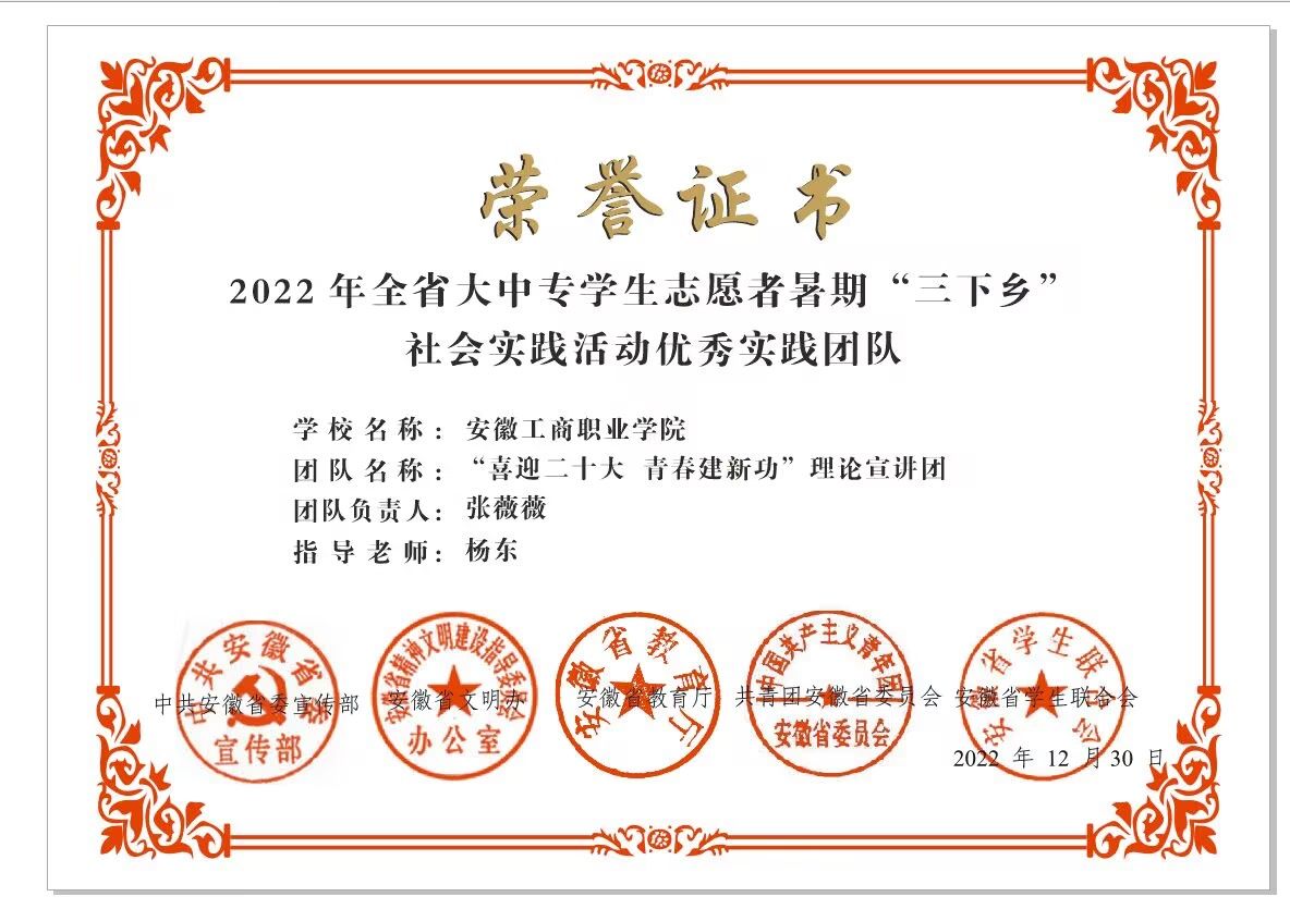 工作室荣获 2022年安徽省大中专学生志愿者暑期“三下乡”社会实践活动优秀实践团队
