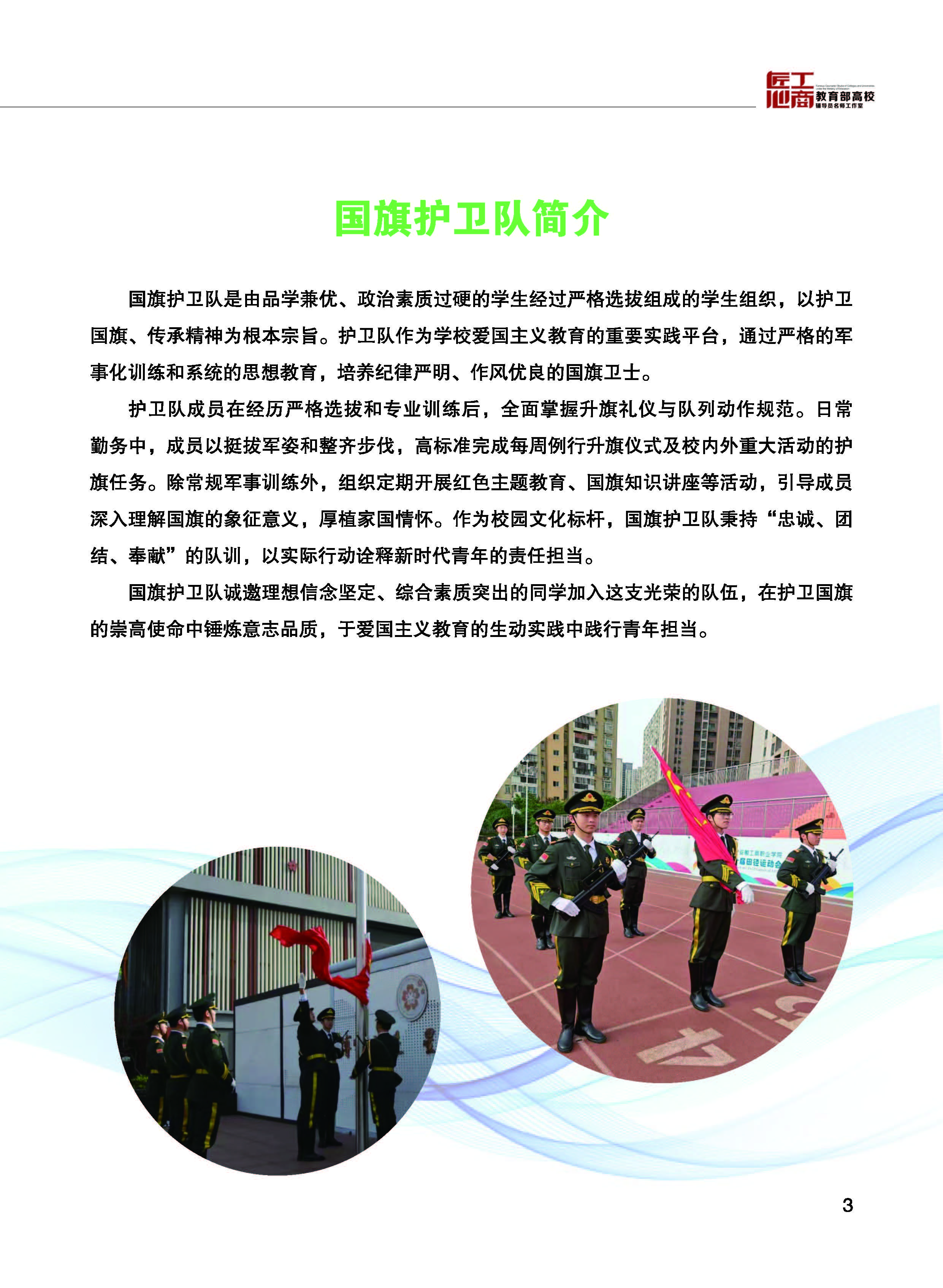 国旗护卫队是由品学兼优、政治素质过硬的学生经过严格选拔组成的学生组织,以护卫国旗、传承精神为根本宗旨。护卫队作为学校爱国主义教育的重要实践平台,通过严格的军事化训练和系统的思想教育,培养纪律严明、作风优良的国旗卫士。