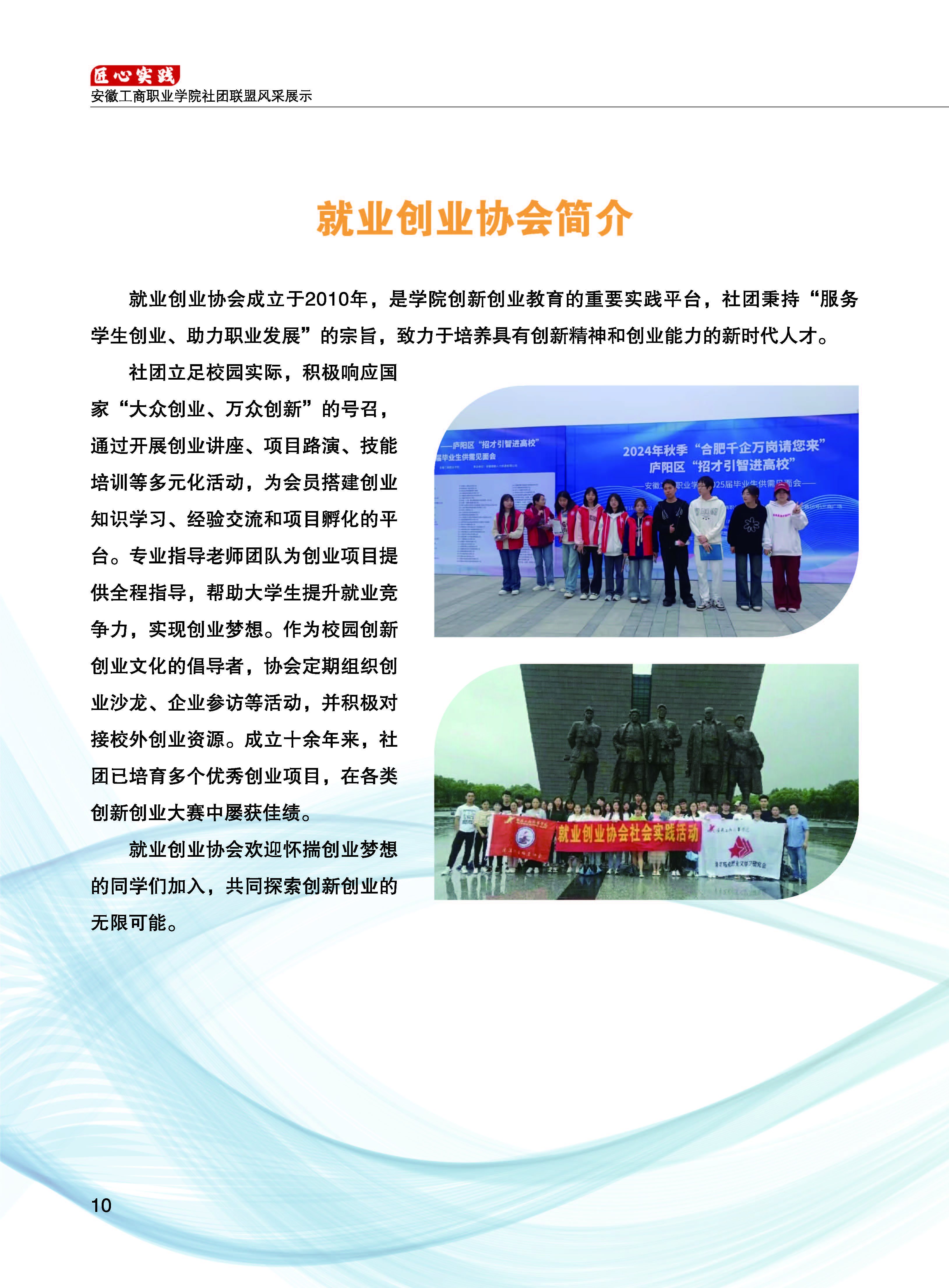 就业创业协会成立于2010年,是学院创新创业教育的重要实践平台,社团秉持“服务学生创业、助力职业发展”的宗旨,致力于培养具有创新精神和创业能力的新时代人才。