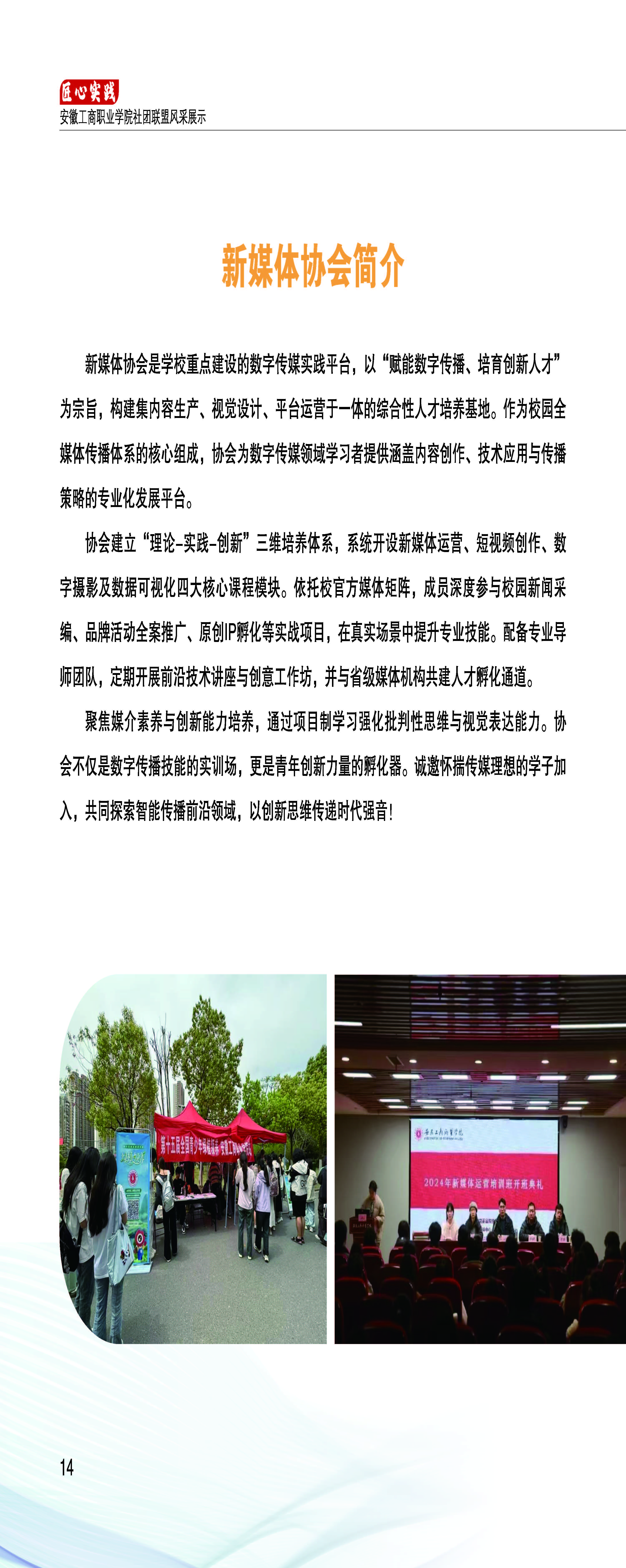 新媒体协会是学校重点建设的数字传媒实践平台,以“赋能数字传播、培育创新人才”为宗旨,构建集内容生产、视觉设计、平台运营于一体的综合性人才培养基地。作为校园全媒体传播体系的核心组成,协会为数字传媒领域学习者提供涵盖内容创作、技术应用与传播策略的专业化发展平台。