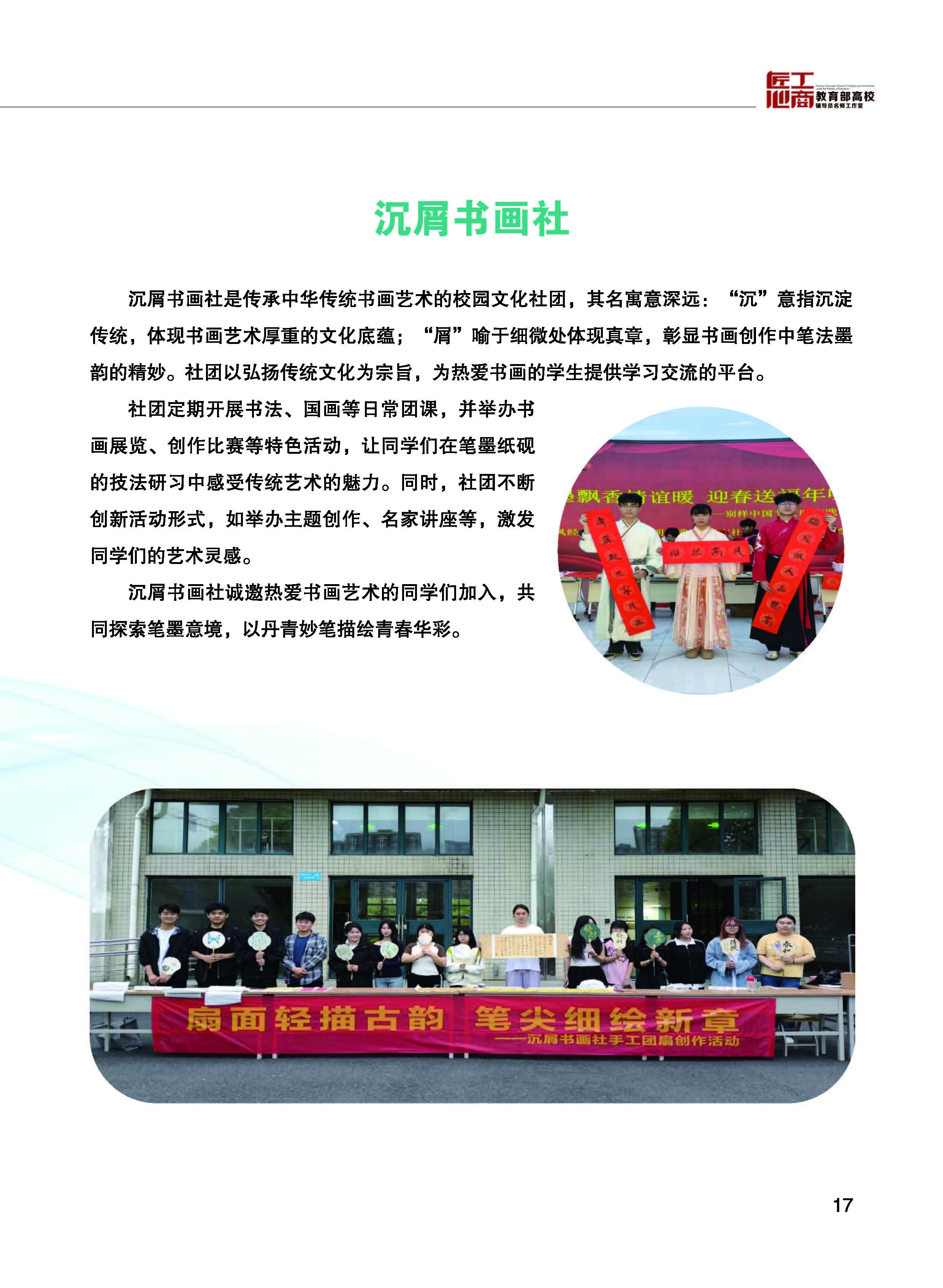 沉屑书画社是传承中华传统书画艺术的校园文化社团,其名寓意深远:“沉”意指沉淀传统,体现书画艺术厚重的文化底蕴;“屑”喻于细微处体现真章,彰显书画创作中笔法墨韵的精妙。社团以弘扬传统文化为宗旨,为热爱书画的学生提供学习交流的平台。