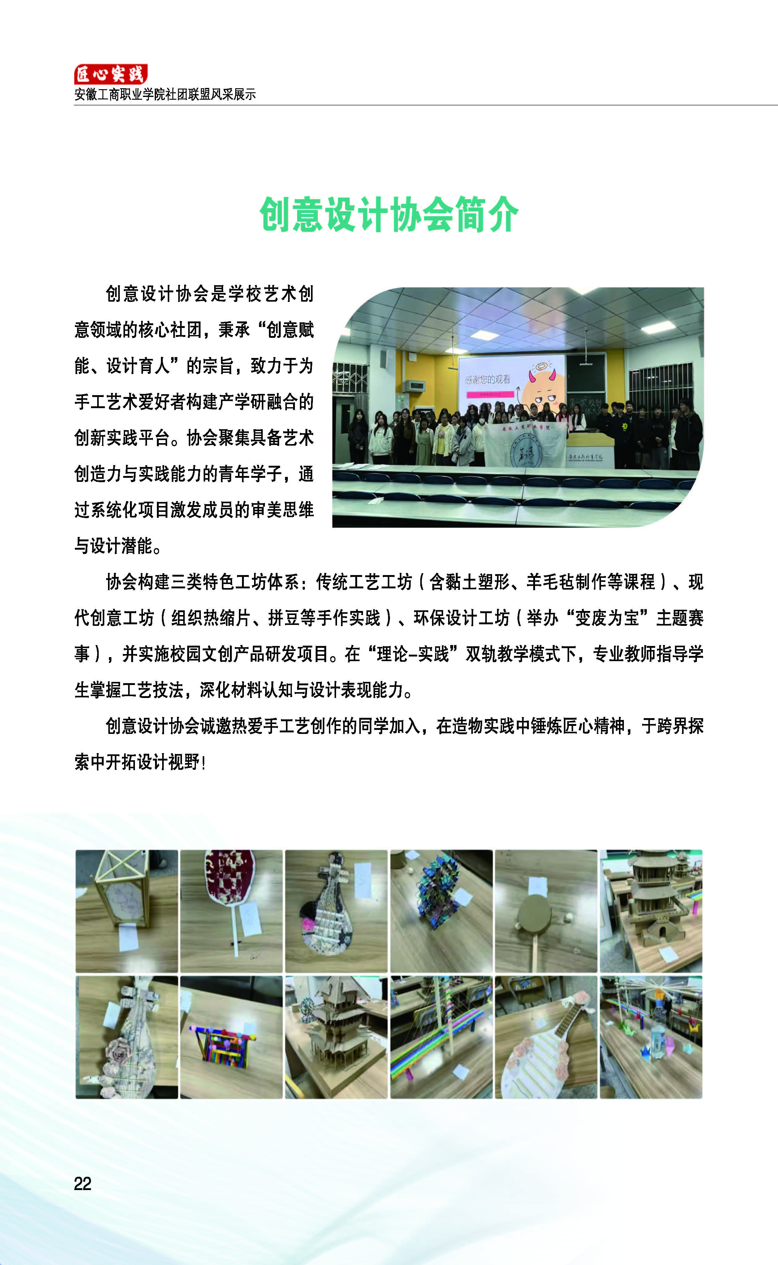 创意设计协会是学校艺术创意领域的核心社团,秉承“创意赋能、设计育人”的宗旨,致力于为手工艺术爱好者构建产学研融合的创新实践平台。协会聚集具备艺术创造力与实践能力的青年学子,通过系统化项目激发成员的审美思维与设计潜能。