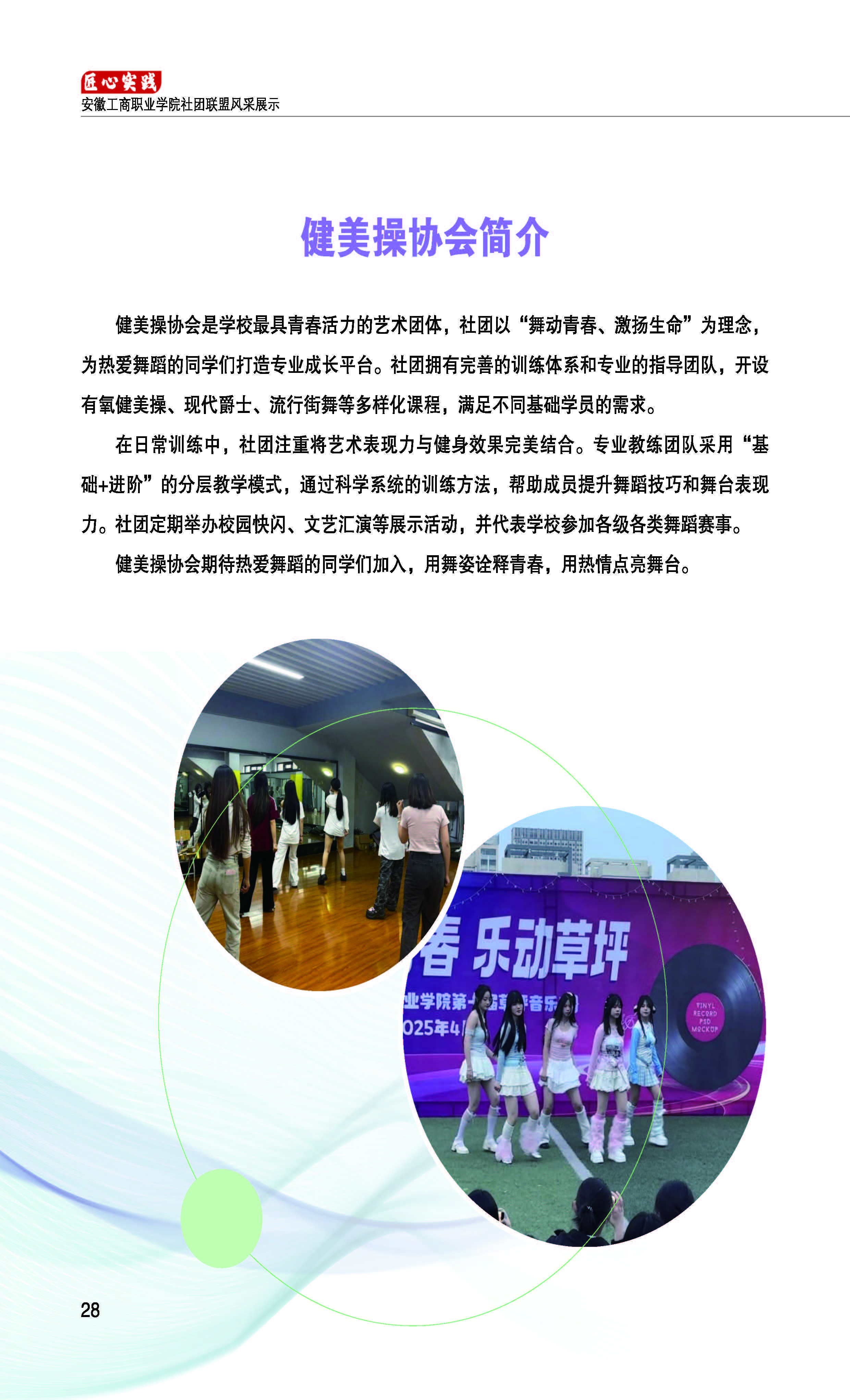 健美操协会是学校最具青春活力的艺术团体,社团以“舞动青春、激扬生命"为理念,为热爱舞蹈的同学们打造专业成长平台。社团拥有完善的训练体系和专业的指导团队,开设有氧健美操、现代爵士、流行街舞等多样化课程,满足不同基础学员的需求。