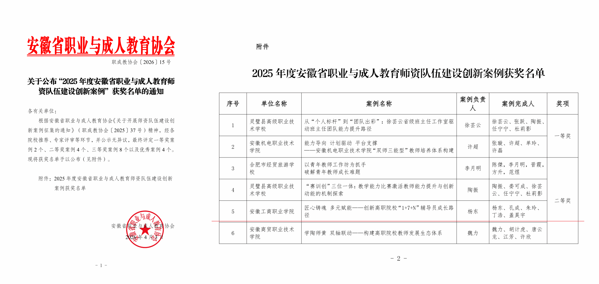 近日,安徽省职业与成人教育协会公布了2025年职业与成人教育师资队伍建设创新案例评选结果。我校教育部首批高校辅导员名师工作室——“匠心工商”工作室申报的《匠心铸魂 多元赋能——创新高职院校“1+7+N”辅导员成长路径》案例成果荣获二等奖,这是我校在辅导员队伍建设和思想政治教育工作领域取得的又一项省级重要荣誉。