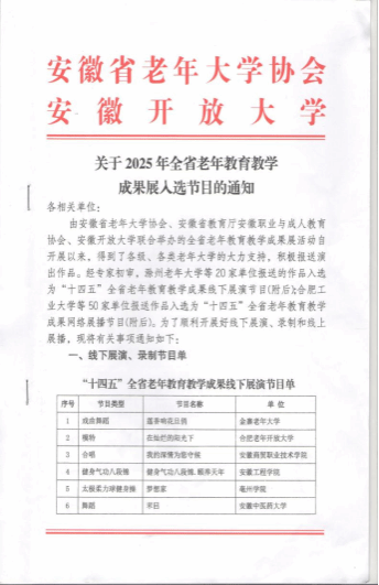 学校积极响应“服务全民终身学习”号召,与杏林街道共建社区教学点,稳步推进老年大学建设。通过修订《安徽工商职业学院老年大学章程》,建立健全管理机制,开设声乐、舞蹈、葫芦丝等多类课程,服务老年学员150余人。老年大学选送的《水兵舞》《春风十万里》等优秀作品成功入选2025年全省老年教育教学成果展线上展演,实现学习成果的高水平展示。