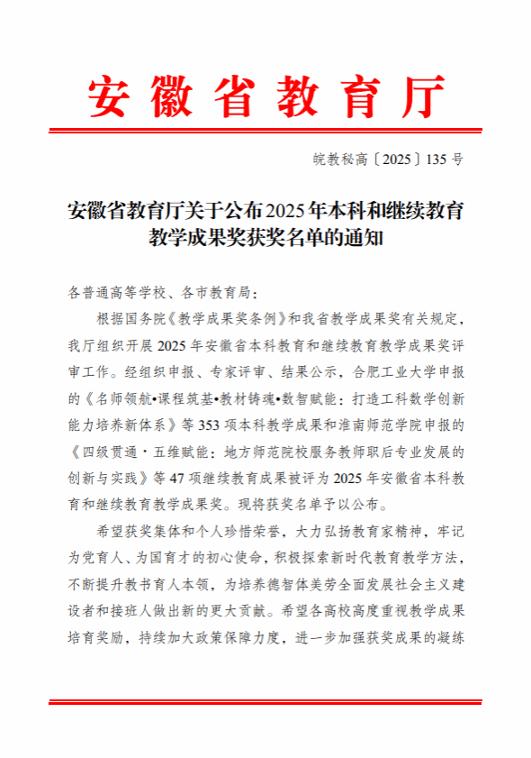 近日,安徽省教育厅正式公布2025年省级教学成果奖评选结果,我校继续教育成果《多元协同、数智赋能、德技并修:面向新兴产业与乡村振兴的终身学习模式融合创新与实践》荣获二等奖,该成果聚焦终身学习模式的创新,反映了我校在相关领域的改革与实践进展。