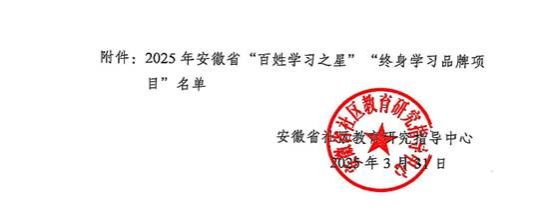 近日,安徽省社区教育研究指导中心公布2025年全省新时代“百姓学习之星”“终身学习品牌项目”遴选结果。我校申报的“知行学堂——赋能乡村振兴与全民学习的创新实践”项目获评2025年安徽省“终身学习品牌项目”。