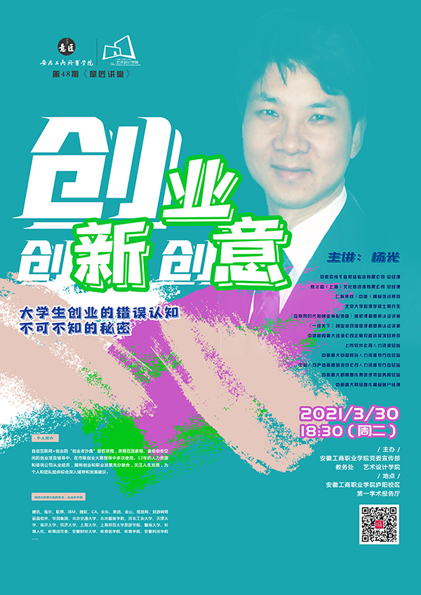 3月30日晚,安徽工商职业学院第四十八期意匠讲堂《大学生创业的错误认知和不可不知的秘密》在庐阳校区第一学术报告厅开讲。本期讲堂特邀安徽京成东就网络科技有限公司总经理,《互联网时代的创业模拟沙盘》版权课程首席认证讲师杨光主讲,艺术设计学院各班班委及部分同学作为代表参加了本次讲堂。讲堂由学院团总支书记何倩云主持。