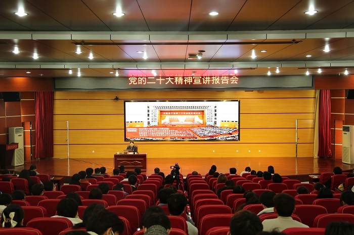 胡培培以“凝心聚力擘画复兴新蓝图 团结奋进创造历史新伟业”为题,从参会的经历与体会、党的二十大报告主要精神和贯彻意见三个方面与大家分享了参加党的二十大时的所见、所闻、所感,全面宣讲了党的二十大的主题和主要成果、全面建设社会主义现代化国家的目标任务、坚持党的全面领导和全面从严治党等内容,并从坚持把党的创新理论与具体实践相结合、立足岗位建功立业的角度向与会师生提出贯彻建议。