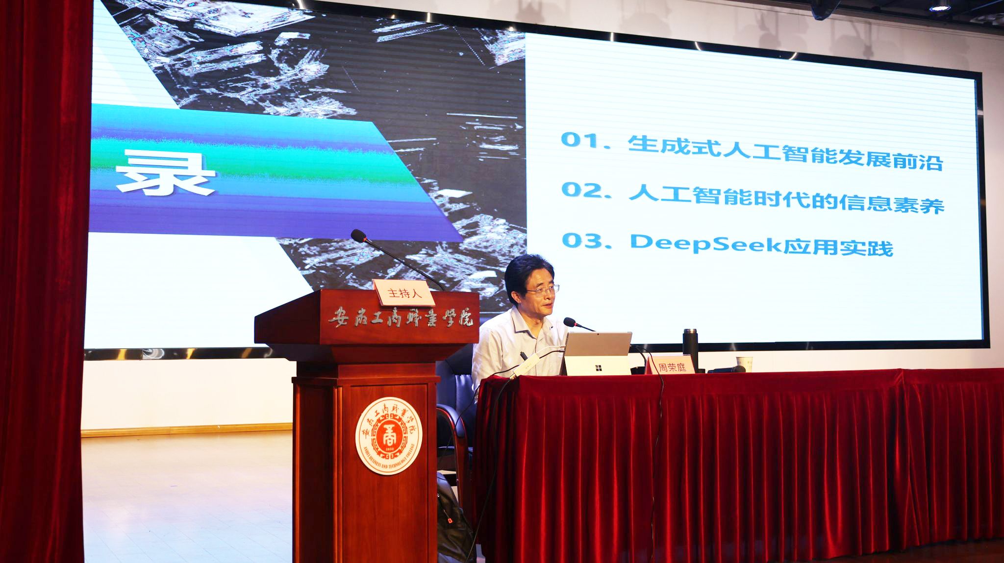 5月14日下午,在全国职业教育活动周良好氛围下,校党委第六次理论学习中心组学习(扩大)会暨第五十二期工商大讲堂在学校大学生活动中心举行。中国科学技术大学二级教授、博士生导师周荣庭应邀作题为“生成式人工智能发展前沿与DeepSeek实践应用”专题辅导报告。校党委副书记陈行主持会议,校领导、全校中层干部、各二级学院师生代表500余人参加本次讲座。