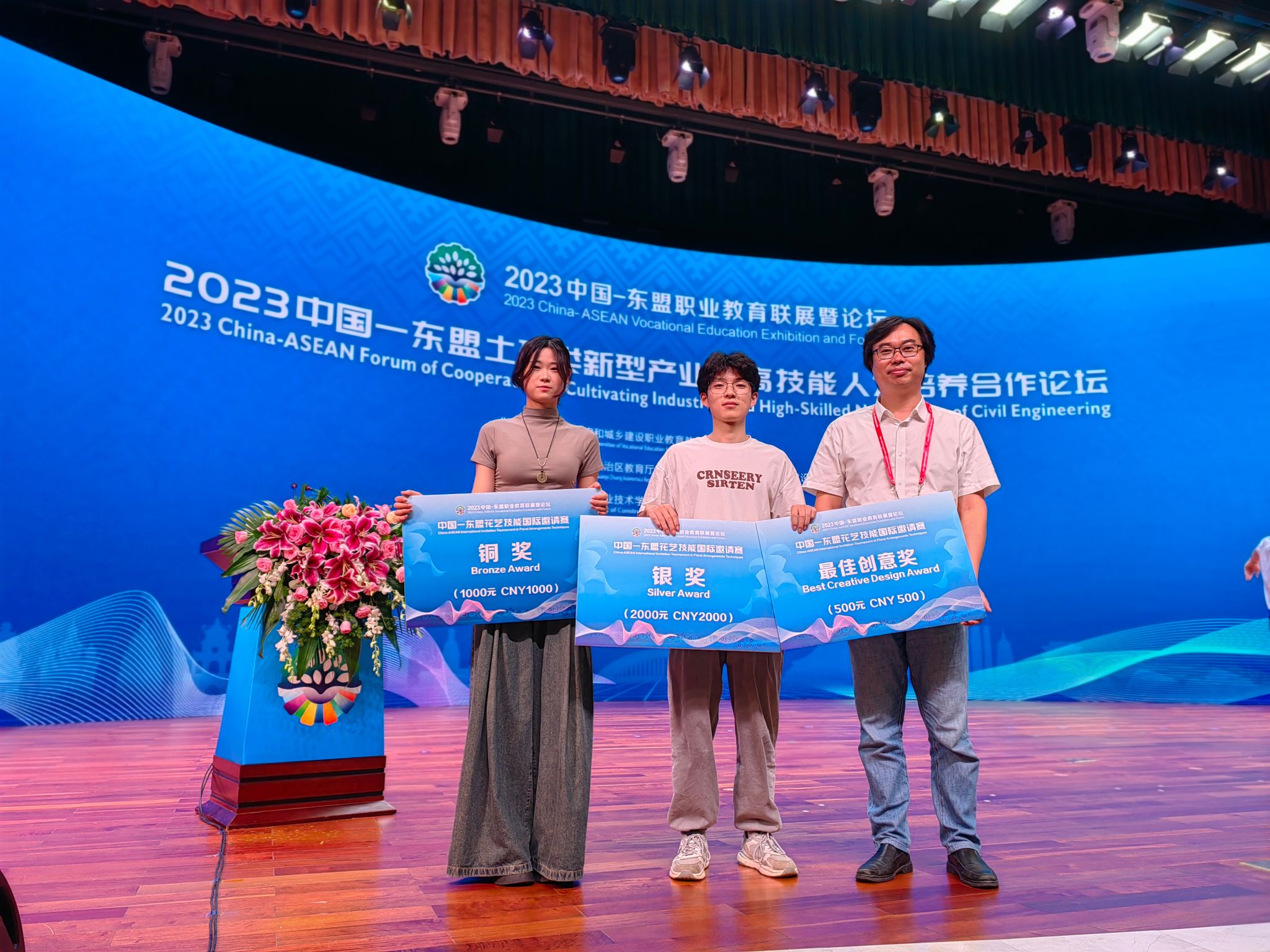 9月15日,由全国住房和城乡建设职业教育教学指导委员会指导,广西壮族自治区教育厅主办,广西建设职业技术学院承办的2023中国—东盟花艺技能国际邀请赛落下帷幕。我校艺术设计学院21级产品艺术设计专业张成飞获得银奖和最佳创意奖,22级产品艺术设计专业魏紫姸获得铜奖。这次国际邀请赛共有13个院校19位选手参赛,分别来自中国、日本、马来西亚等国家代表队参赛。安徽省仅有我校应中国住房和城乡建设部教指委邀请参赛。校党委委员、党委宣传统战部部长、艺术设计学院党总支书记孔成带队参赛并担任裁判。