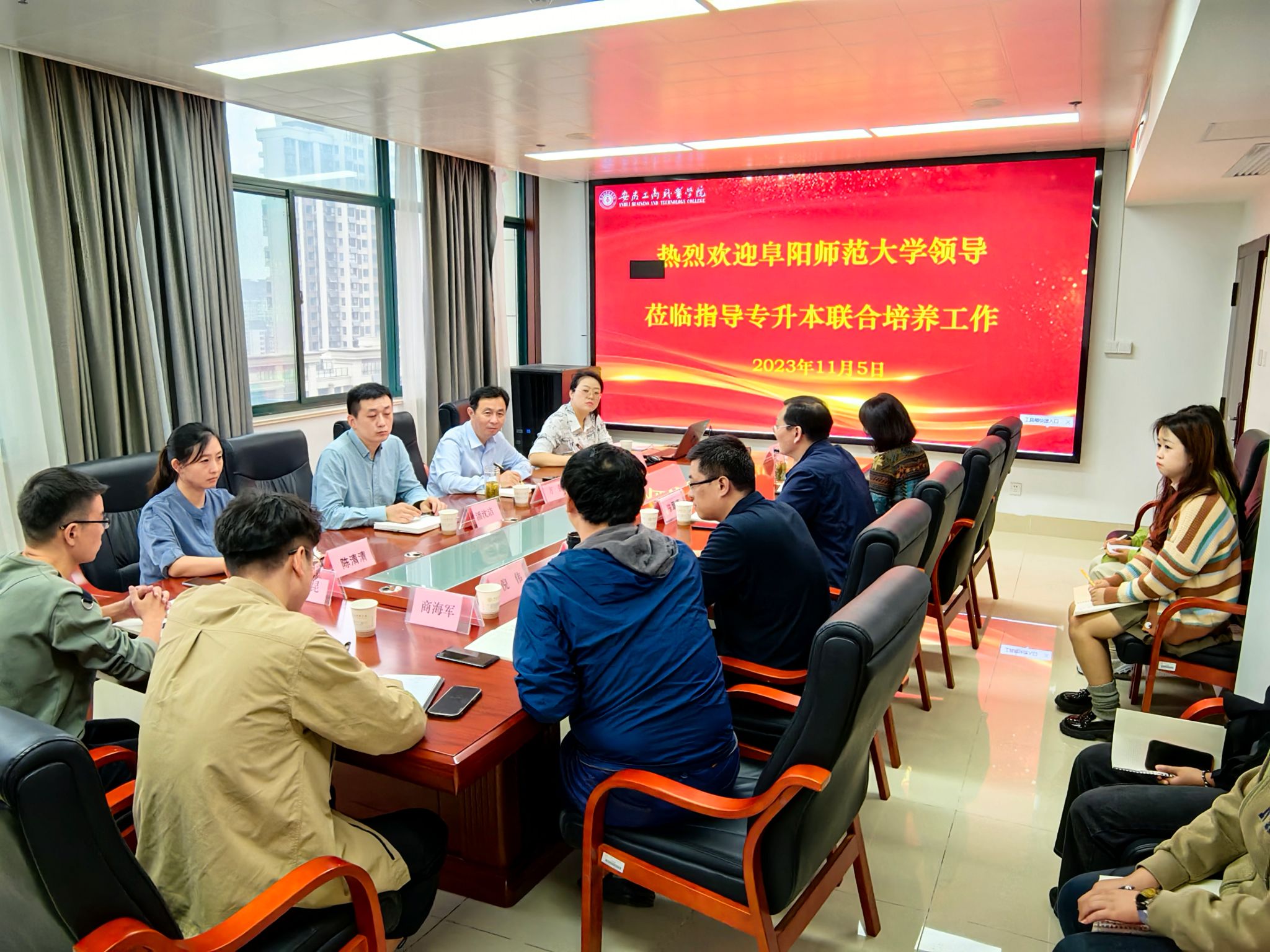 11月5日上午,阜阳师范大学党委委员、招生就业处处长方强一行来我院考察指导专升本联合培养情况,学院党委委员、副院长陈章奇等接待了方强一行,教务处、学生处部门负责人以及管理学院、信息工程学院部分师生参加了接待和座谈。