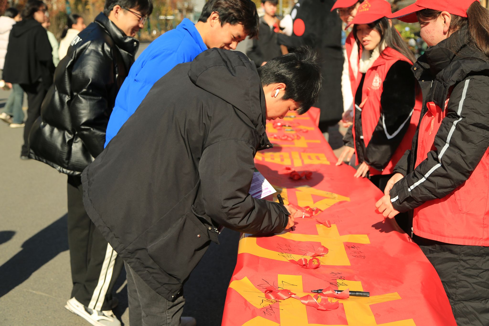 12月1日中午,校青年志愿者协会红丝带团队在学校公寓区开展为“艾”祈福签字活动,并给过往的同学们发放宣传单、进行微宣讲,普及艾滋病相关知识,让同学们进一步认识到艾滋病的现状,正确看待艾滋病传播感染途径。