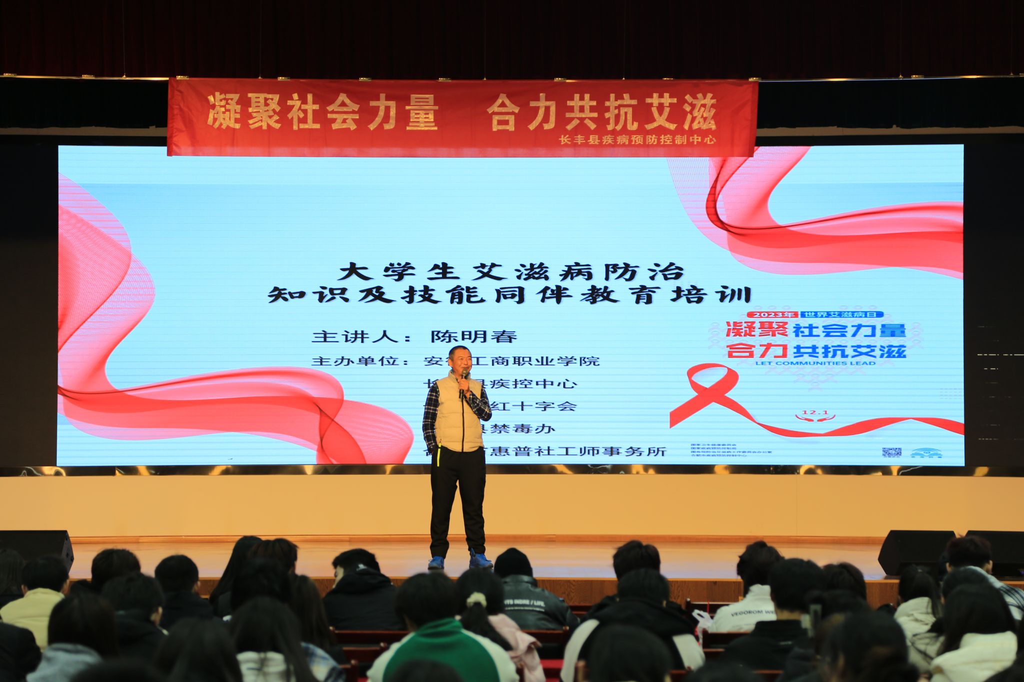 12月1日上午,我校邀请长丰县疾病防控中心陈明春主任在大学生活动中心宣讲艾滋病防控知识。他针对大学生对艾滋病知识匮乏、预防知识了解片面、对艾滋病蔓延的危机感和自我保护意识淡薄等情况,深入浅出地讲解了艾滋病的致病原理、发病状况、传播途径、防治措施等相关知识,用生动的事例、大量的数据让同学们深刻的了解了艾滋病的危害、有效防治艾滋病的具体措施以及自身在预防艾滋病工作中的重要作用。