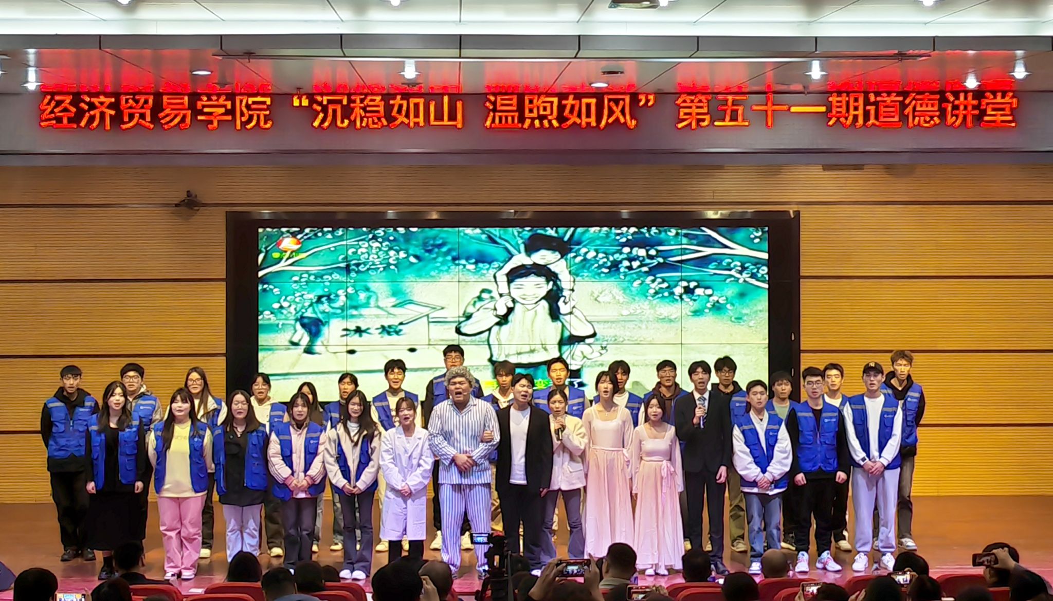 “我就盼着你给我争气呢啊!”、“你这是写字啊你这是!这锄头耙子似的这个,你这样能考上大学吗你?”、“你给爸争气了啊,念了大学,有了工作,成家了!”演员“父亲”微微的一个颤抖,轻抬的一个眼神都诠释着父爱如山。 朗诵表演《父爱》饱含深情,现场观众深刻感受到父爱的无私与亲情的伟大,始终沉浸在现场温暖走心的氛围里;歌曲演唱《父亲的散文诗》将整场活动推向了高潮,轻柔的旋律,感人的画面,深情的歌词,公益的广告,真情的表演,触动同学们和老师们的心灵,现场不少同学潸然泪下、眼噙泪花。惊风飘白日,光景西驰流。随着《父亲》伴奏响起,本期道德讲堂在所有参演演员和23级同学的合唱和热烈掌声中落下了帷幕。