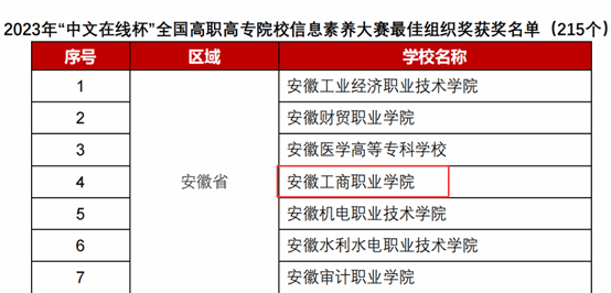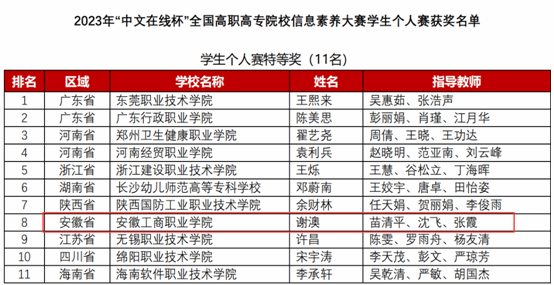 2023年12月3日,由教育部高等学校图书情报工作指导委员会高职高专院校分委员会、高等教育文献保障系统管理中心主办的2023年全国高职高专院校信息素养大赛圆满落幕。本届大赛共有623所院校的1066位参赛选手入围国赛,经过校赛、省赛层层选拔,我校信息工程学院谢澳同学荣获学生组个人赛特等奖,是今年安徽省在此项赛事中取得的唯一国赛特等奖,也是我校在此大赛中取得的历史最好成绩。同时苗清平、沈飞和张霞三位教师荣获国赛“优秀指导教师”,学校荣获国赛“最佳组织奖”。