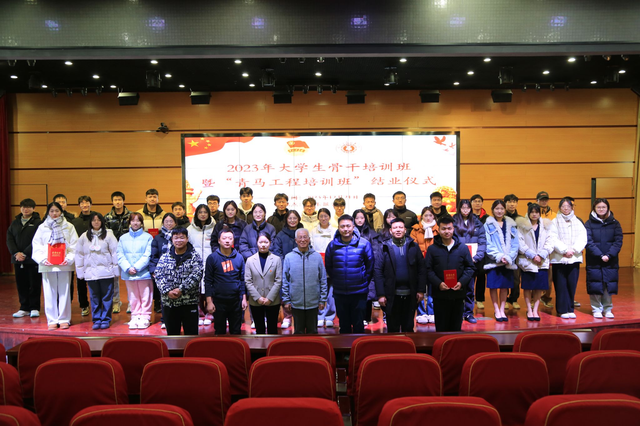 2023年12月22日中午,我校大学生骨干培训班暨“青马工程”培训班结业仪式在学术报告厅举行。校关工委常务副主任吴彦钧,校团委副书记童乐,马克思主义学院老师曾媛媛、校团委老师及全体学员共计300多人参加了结业仪式。童乐为学员代表颁发了结业证书,吴彦钧为优秀学员颁发了荣誉证书。