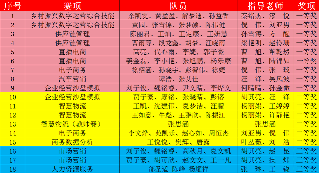 近日,在安徽省教育厅主办的2023年“中银杯”安徽省职业院校技能大赛(高职组)中,管理学院代表队再创佳绩,取得九个一等奖、六个二等奖和三个三等奖的优异成绩。在所参加的十个赛项中均有斩获,其中乡村振兴数字运营综合技能、供应链管理、直播电商三个赛项六支参赛队均获得省一。依据省教育厅相关政策,我院共有34名同学取得专升本免笔试资格。优异成绩的取得体现了我院学生在各项赛事中高超的专业技能水平,展现了学院专业建设的成果。
