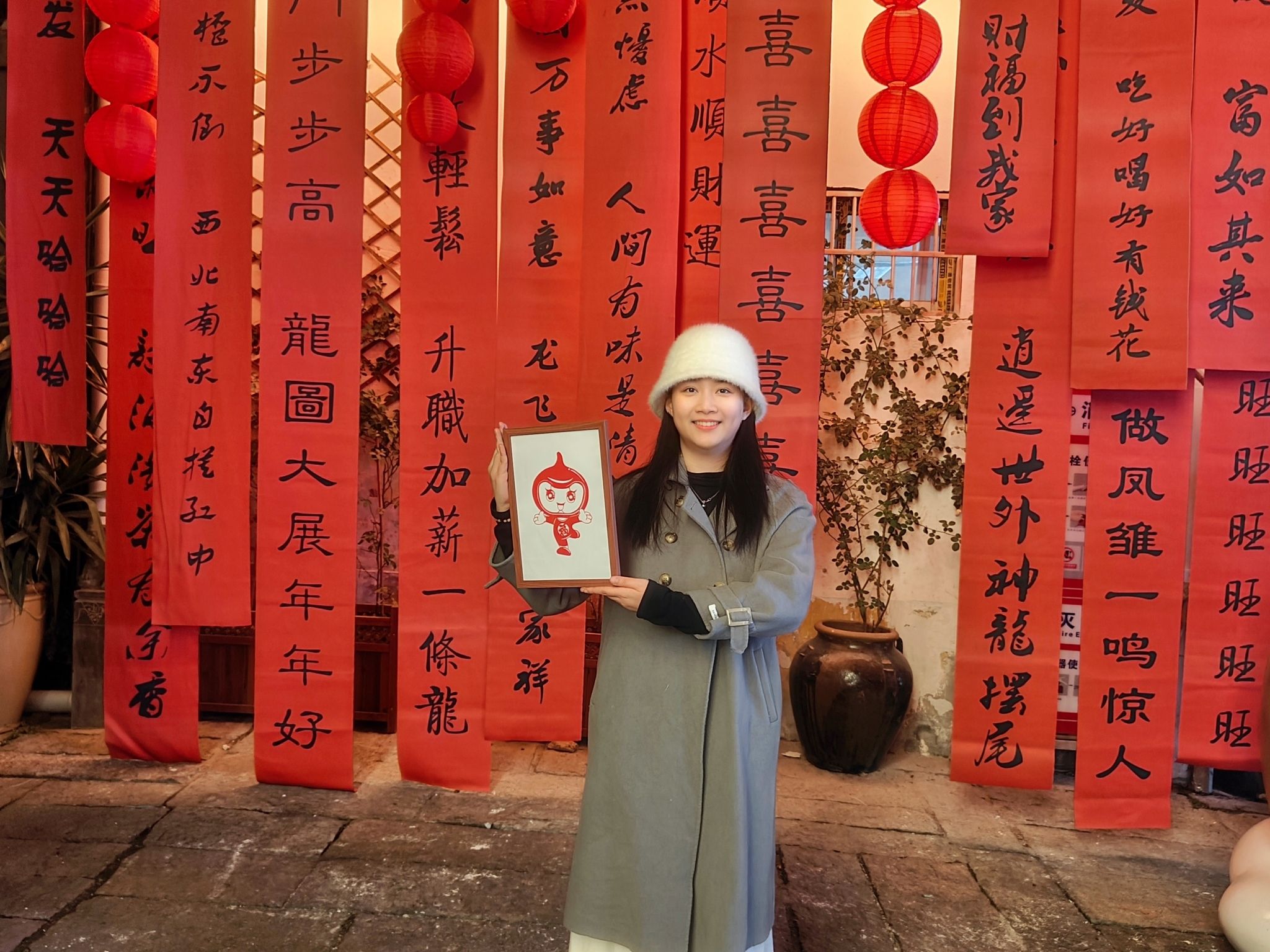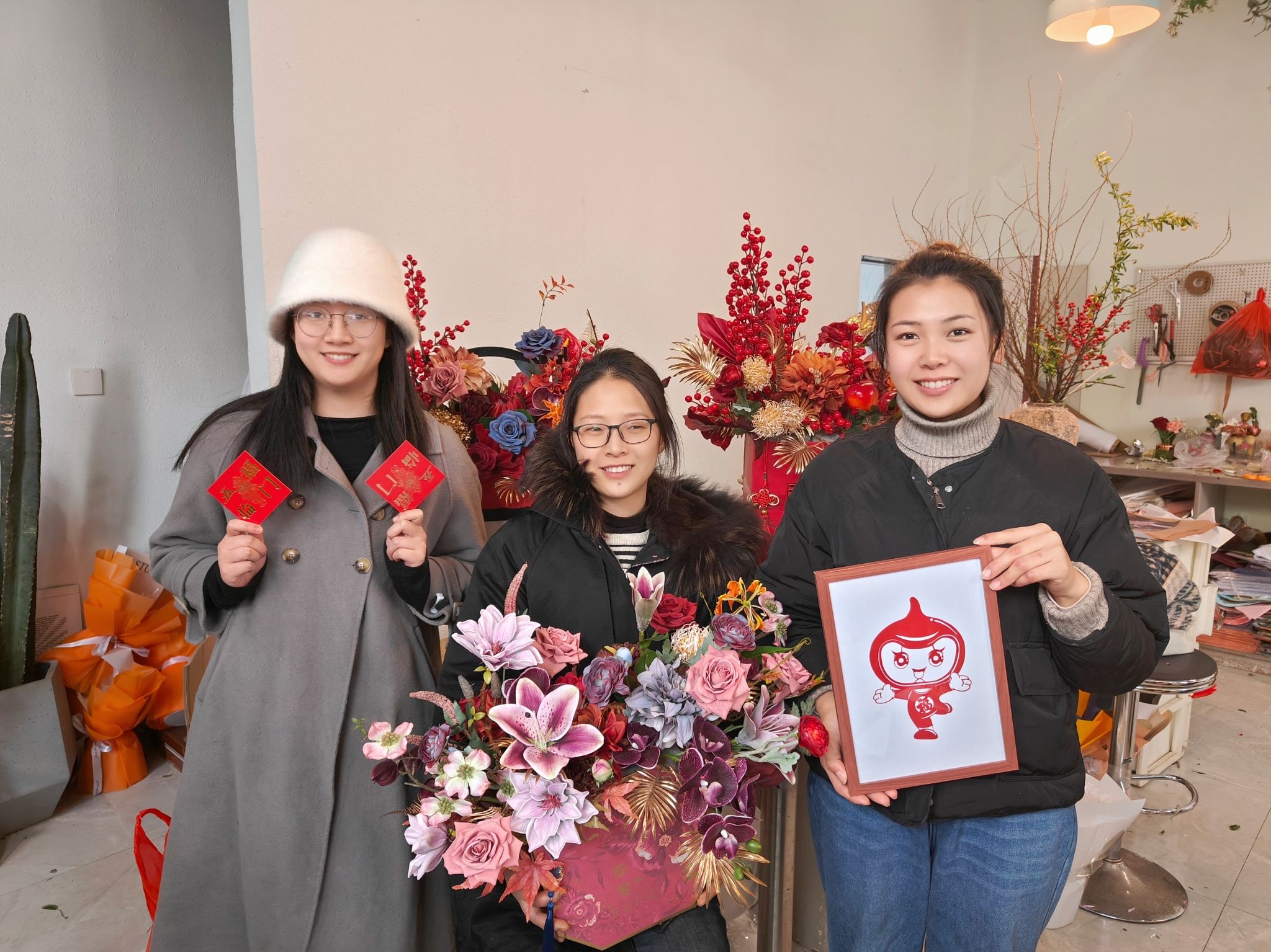 2024年1月28日,在新年即将到来之际,戴玉凡将全国双创周“合合”剪纸送给了家乡的一个花店老板。“之前每次路过那里,我都会停下来,隔着玻璃看店里面的鲜花和老板姐姐忙碌的身影。我想,也许,他们给予了我很多设计的灵感。”