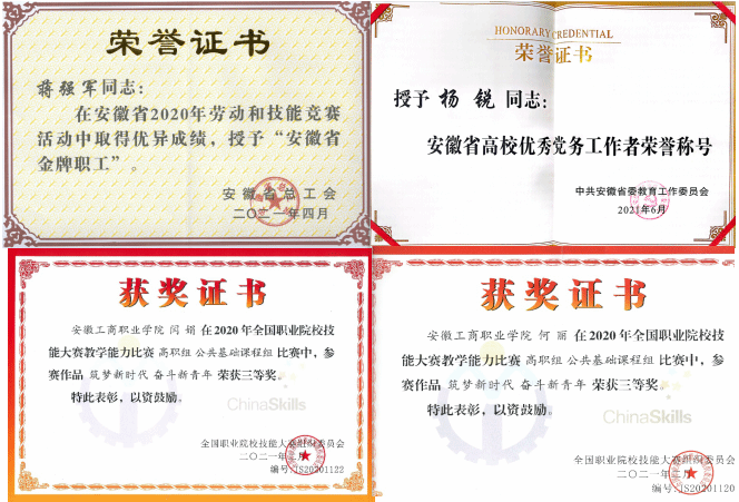 五年来,马克思主义学院以各类教学比赛为抓手,以课程建设为载体,以赛促建,以赛促改,打造创新教师团队。思政课教师在国家级、省级教学比赛中屡获佳绩,2020年以来,先后获得全国职业院校技能比赛教学能力大赛“三等奖”1项,获省高等职业院校教学能力比赛一等奖3项、二等奖4项、三等奖5项。获首届安徽省职业院校技能大赛课程思政教学竞赛一等奖1项。获全省第六届普通高校青年教师教学竞赛“三等奖”1项。指导大学生讲思政课比赛省赛三等奖1项。