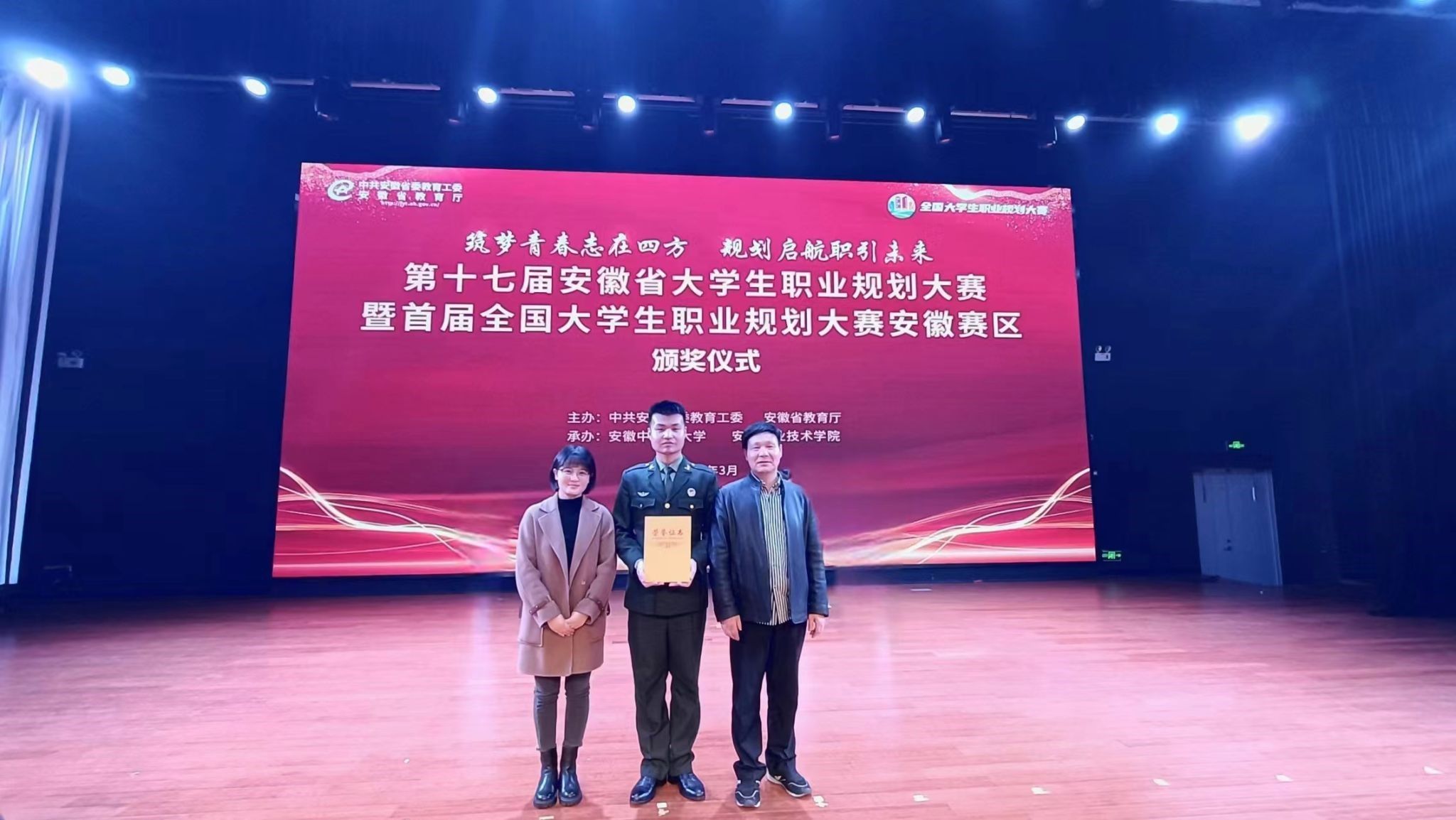 筑梦青春志在四方,规划启航职引未来。3月13日至14日,由中共安徽省委教育工委、安徽省教育厅主办的第十七届安徽省大学生职业规划大赛暨首届全国大学生职业规划大赛安徽赛区总决赛在安徽中医药大学、安徽职业技术学院举行。我校管理学院刘志强同学、旅游健康学院邰文婷同学,分别获得成长赛道(职教组)一等奖和就业赛道(职教组)二等奖,大学生职业生涯规划与就业指导教学团队获得教学赛道三等奖。