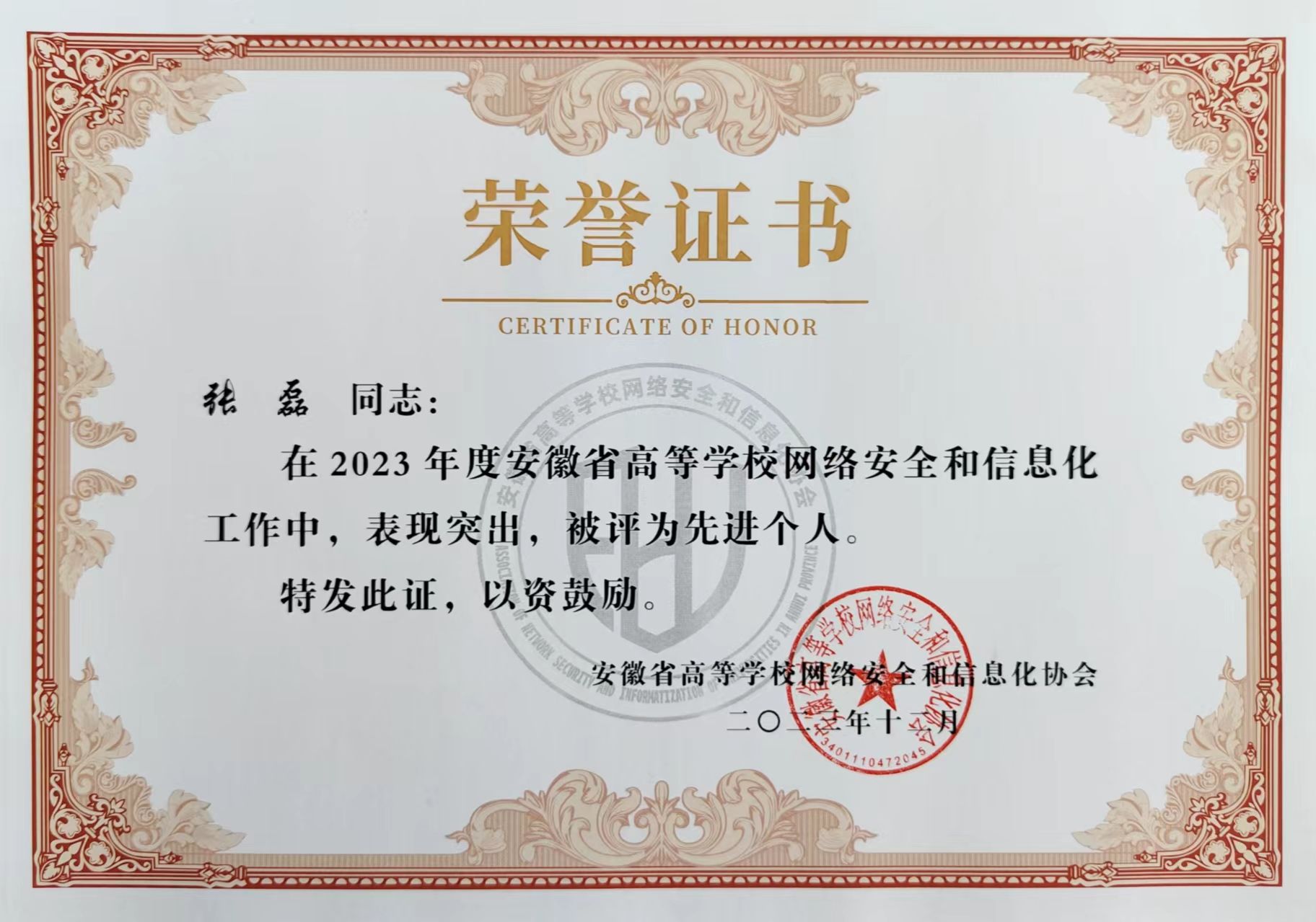 本次会议就教育数字化转型、智慧校园建设、网络安全管理等方面对全省高校信息化工作重点进行了研讨,对2023年全省网络安全和信息化工作表现优异的集体和个人进行了表彰。我校因网络安全和信息化工作成绩突出,继2016、2017、2018、2020、2022年获奖后,再度荣获2023年度安徽省高校网络安全和信息化工作先进集体,张磊老师被评为2023年度安徽省高校网络安全和信息化工作先进个人。