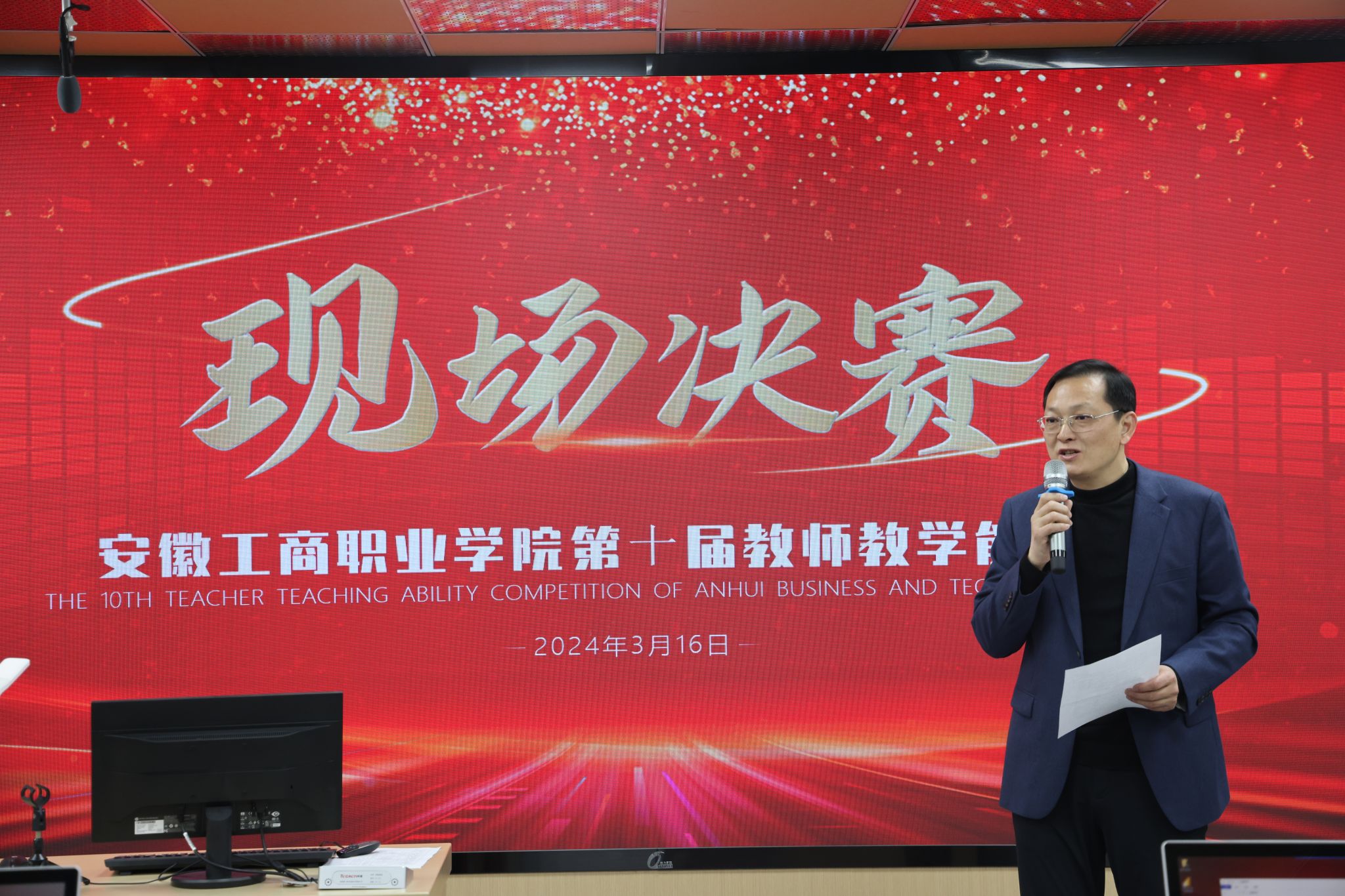 为深入贯彻习近平总书记关于职业教育工作的重要指示精神,落实《教育部安徽省人民政府关于整省推进职业教育一体化高质量发展加快技能安徽建设的意见》《中共安徽省委安徽省人民政府关于加快职业教育改革发展服务现代化美好安徽建设的意见》等部署,深化“三教”改革,促进教师综合素质、专业化水平和创新能力全面提升,3月16日,学校第十届教师教学能力大赛现场决赛在综合楼举行。院党委委员、副院长陈章奇出席了本次活动,教务处、各二级学院负责人、参赛教师等到现场进行了观摩,活动由教务处副处长郭雪峰主持。
