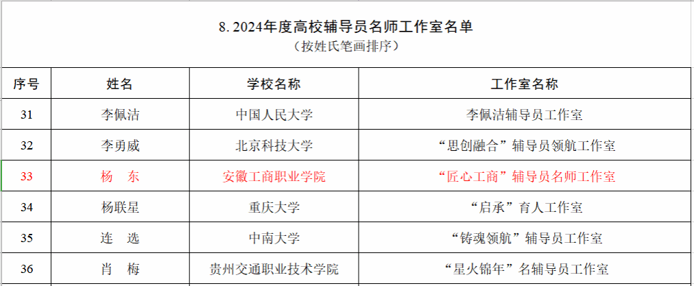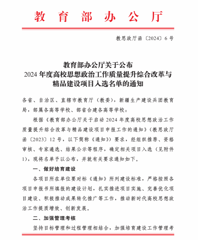 近日,教育部办公厅公布了2024年度高校思想政治工作质量提升综合改革与精品建设项目立项名单,由智能制造与汽车学院专职辅导员杨东牵头申报的《“匠心工商”辅导员名师工作室》成功入选2024年度高校思想政治工作精品建设项目。本次申报全省共四所高校获批,我校为唯一获批高职院校。
