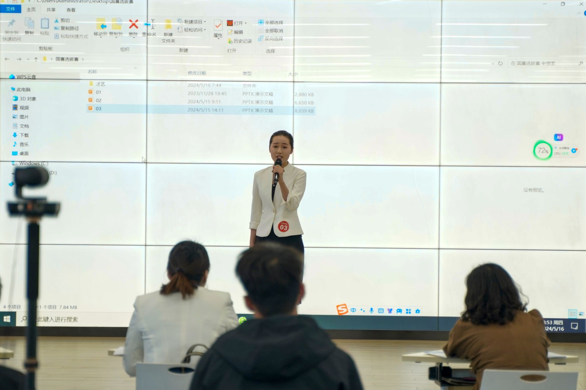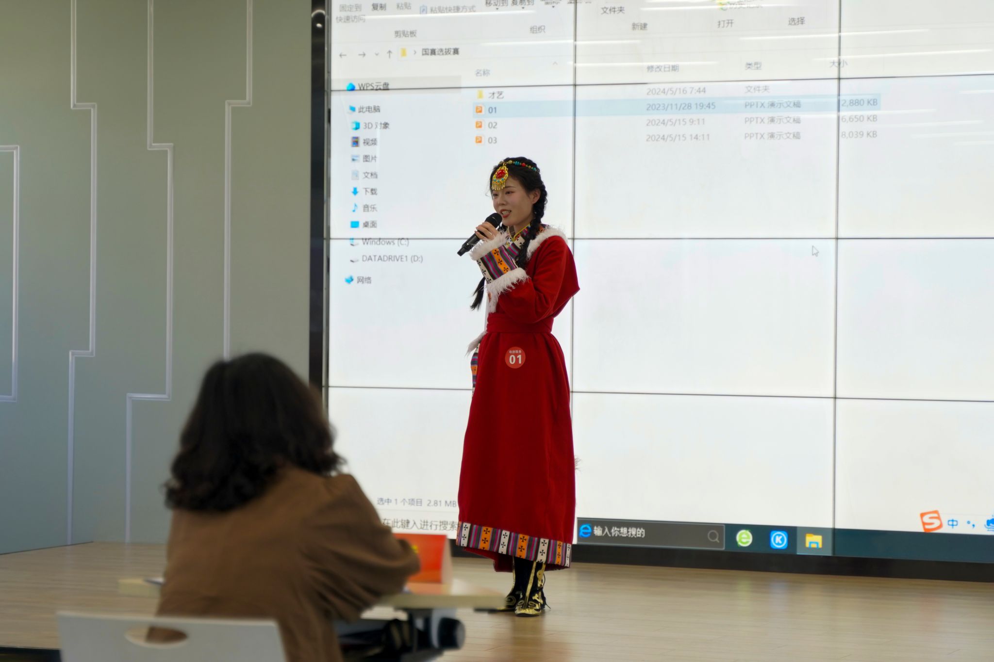 “导游服务”赛项为个人赛,由导游知识测试、现场导游词创作及讲解、自选景点导游讲解、导游英语口语测试和才艺运用5个模块组成。导游知识测试包含1320道公开题库和应变题,现场抽题,书面作答;现场导游词创作及讲解要求选手现场在50个旅游文化元素和5种团型中各抽取一个,现场独立完成现场导游词创作后用中文进行脱稿讲解;自选景点导游讲解环节要求选手进行4分钟的导游讲解;导游英语口语测试环节需要现场抽取导游带团过程中的80种英语情境对话中的一种进行现场对话,考查选手用英语对游客进行导游服务的能力;才艺运用要求选手完成带团过程中的导游情境描述及符合情境的才艺展示。综合评价参赛选手的导游职业技能和专业素养。“导游服务”赛项共三个参赛院校的三名选手参加了比赛。